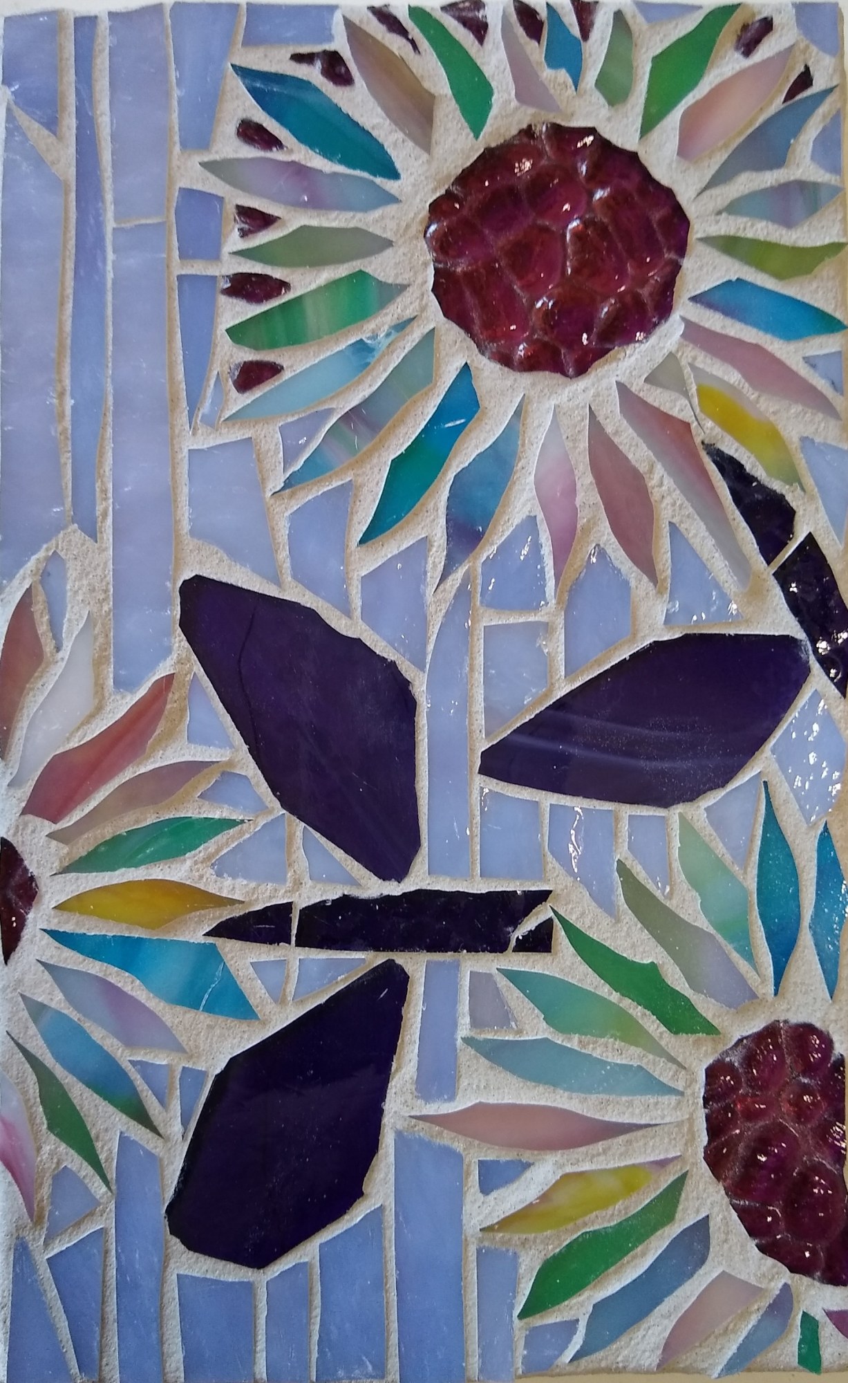 I'm teaching an online mosaic class, "Zooming to Creativity with Mosaics," that's meant to help stimulate people's creativity. They are given a selection of glass and some patterns. They can choose to use a pattern or create their own design. However, the idea is to only work with the glass you received - make something different and out of the ordinary. The piece shows how I converted a simple (nice) pattern to a more unique version. It's not hard; you just need to get past your own expectations for what a piece should look like. Follow this link for more information: