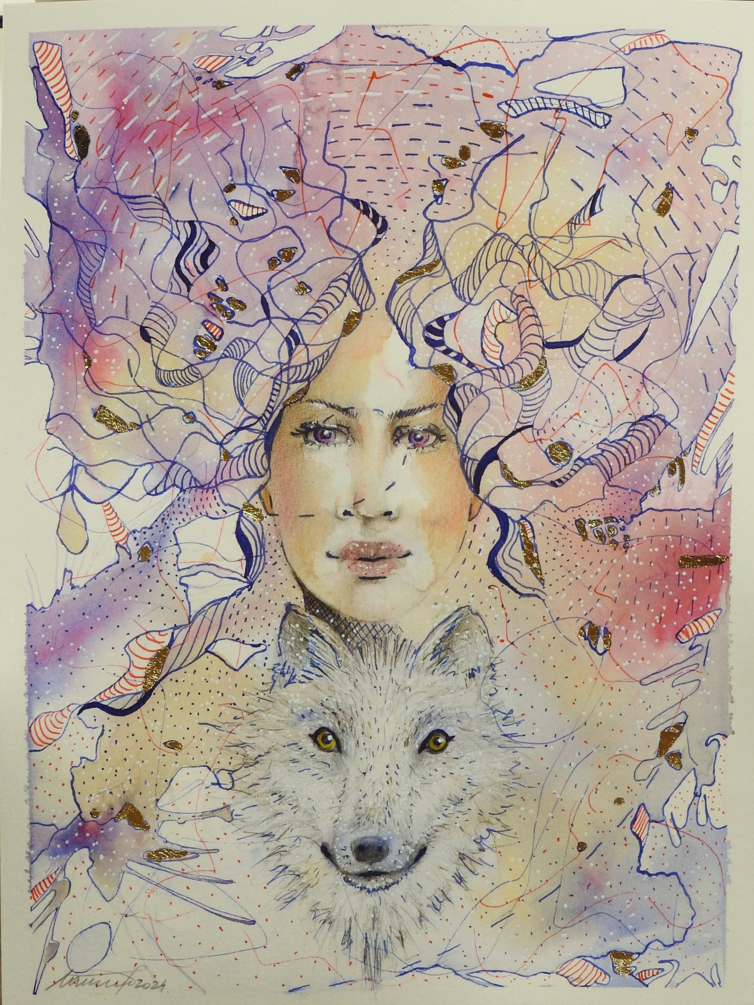 The painting conveys a feeling of freedom, joy of creation, passion and love for nature. The motif of the wolf as a symbol of fidelity, inner strength and intuition further enriches the image, suggesting that sometimes it is necessary to take risks and overcome obstacles in order to learn and grow. Alessia is an Italian female name meaning "protector", adding a deeper meaning to the image, perhaps symbolizing the strength and protection a woman provides to herself or others.