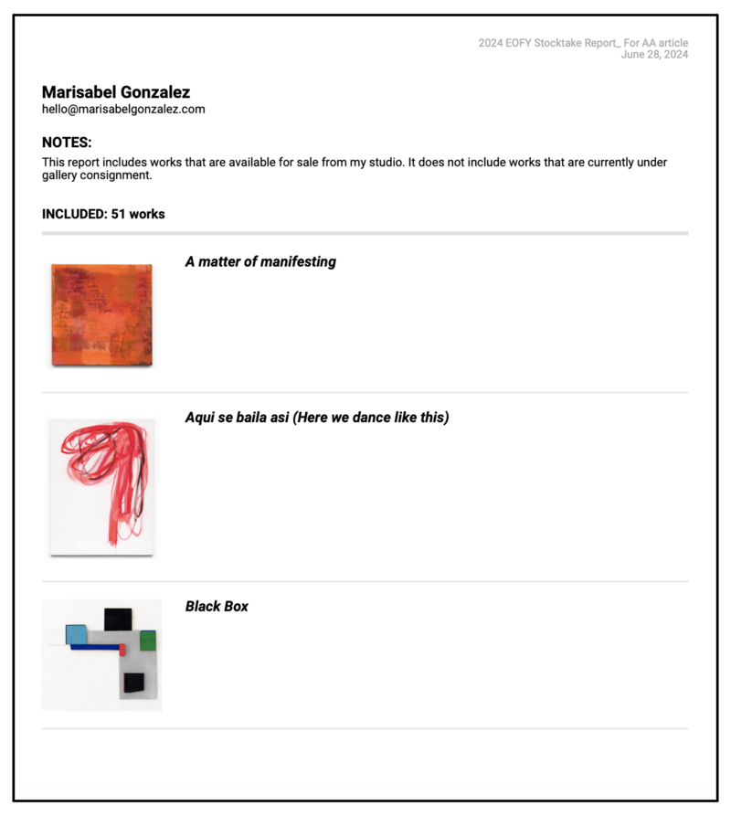 An Inventory Report is a detailed document that lists and describes your entire body of work or specific pieces.