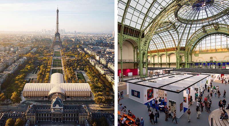 Left: Grand Palais Éphémère, copyright: Wilmotte & Associés Architectes. Right: Art Paris 2020 at the Grand Palais.