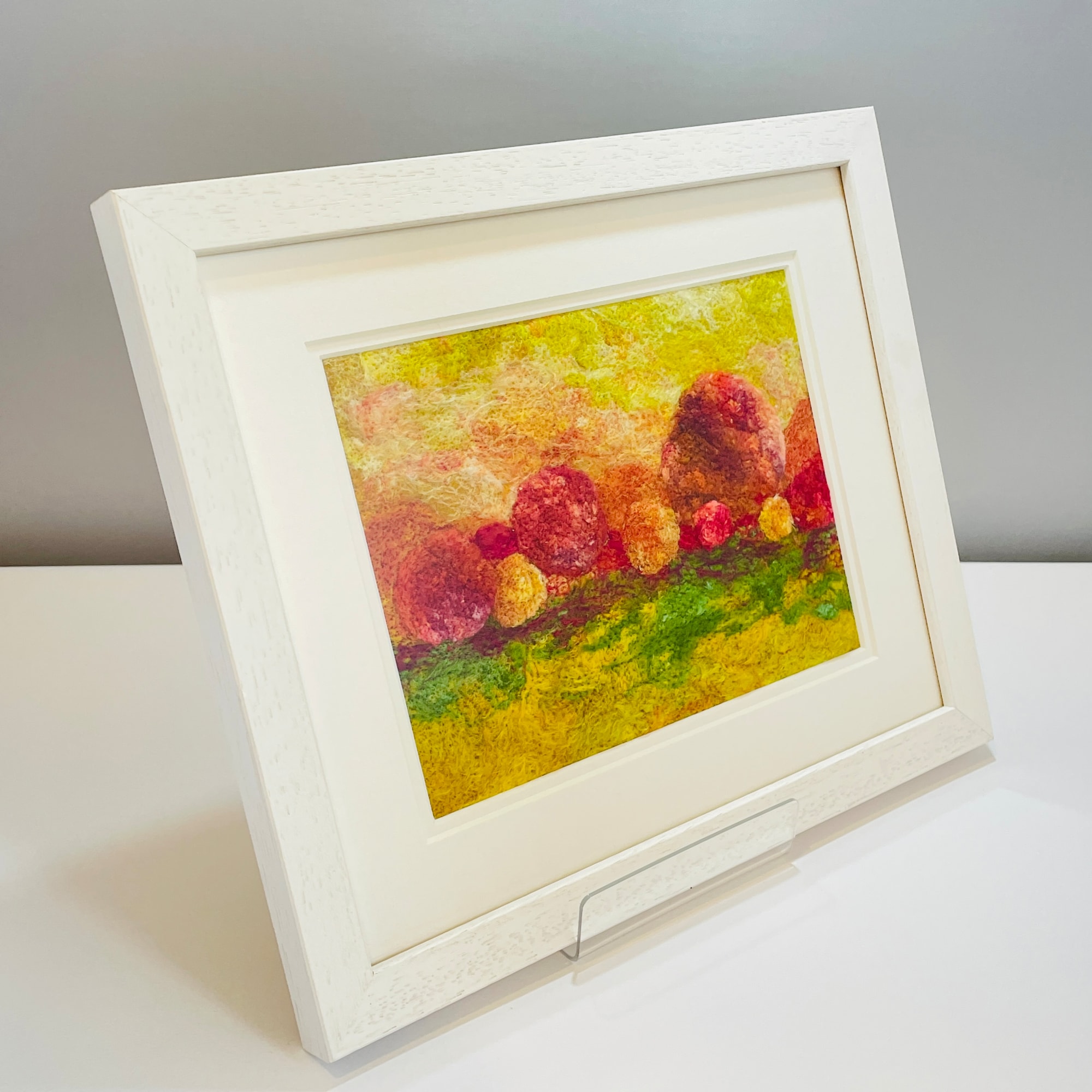 Skilfully crafted from fibre materials such as wool and silk in various forms, this charming original textile artwork features a vibrant and colorful composition with intricate and lively botanical forms. The piece is meticulously brought to life using just needle felt techniques with no glue or stitches.