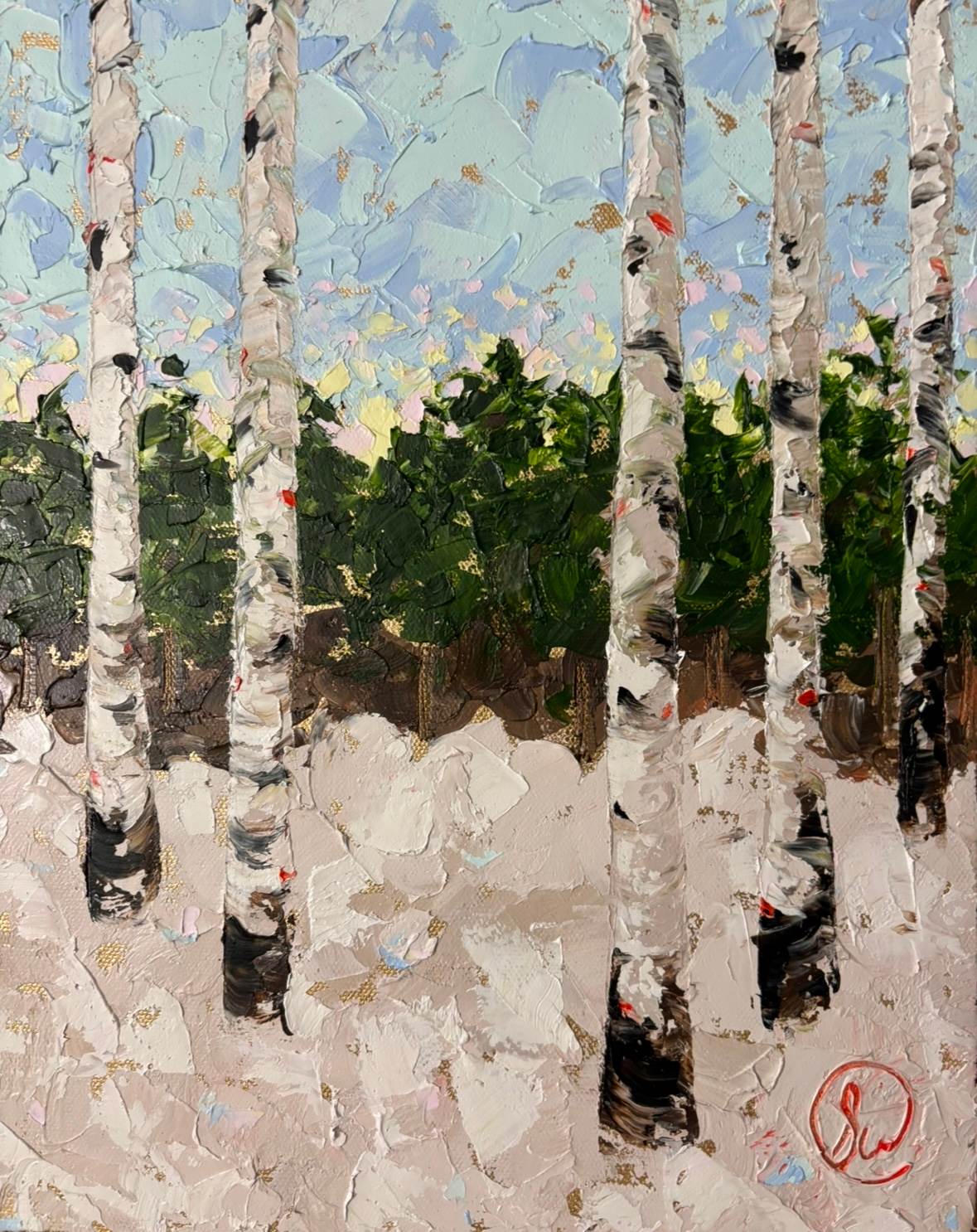 A cheerful palette knife oil painting in canvas. This painting of birch trees at sunrise in the winter was commissioned and readily approved.