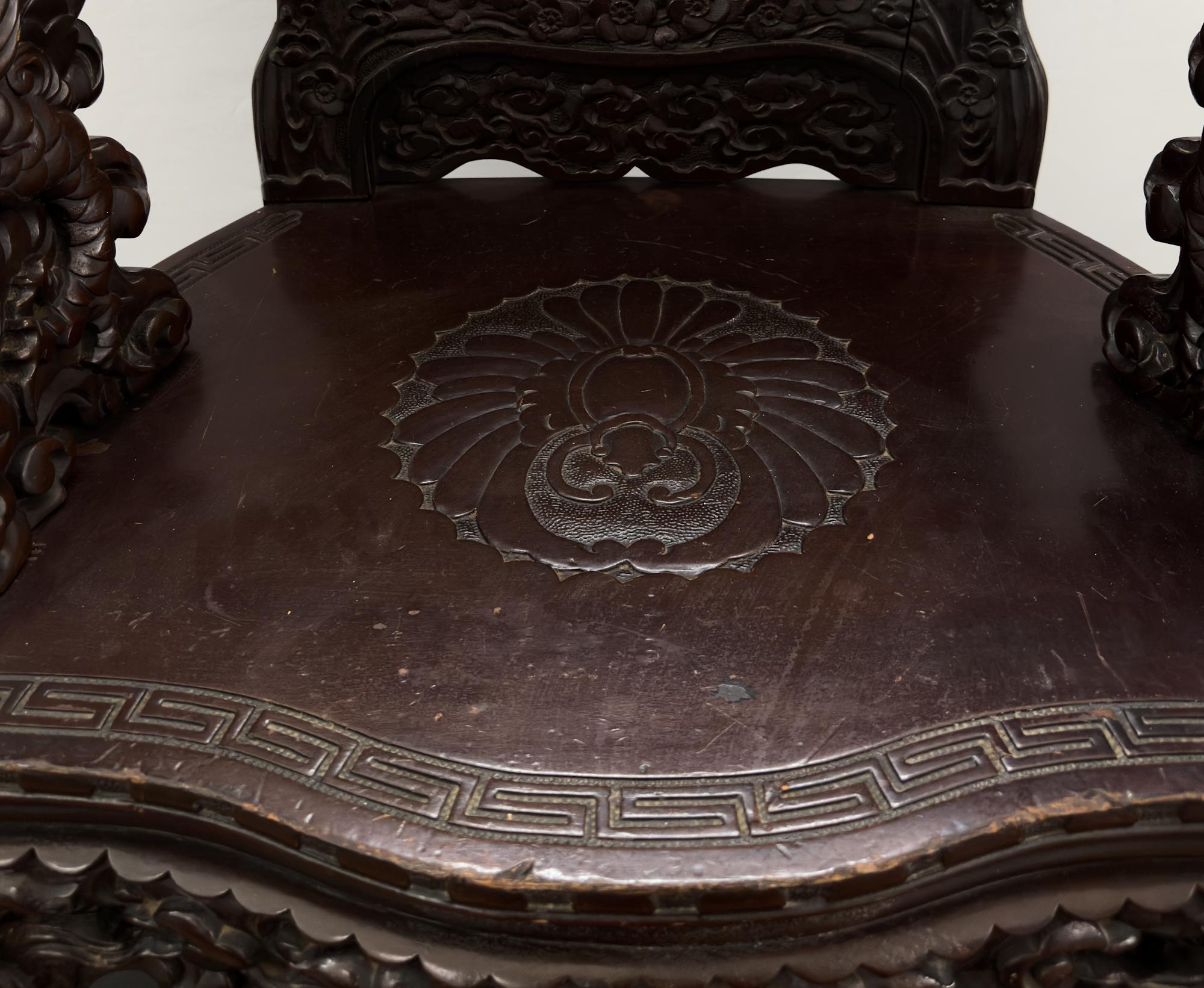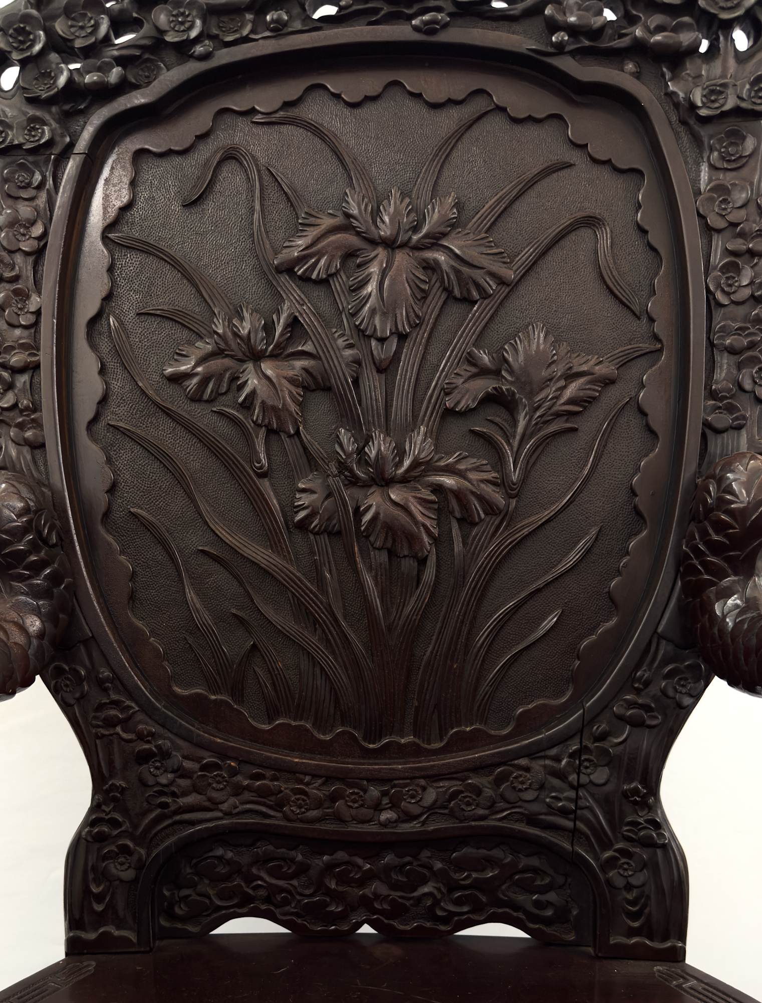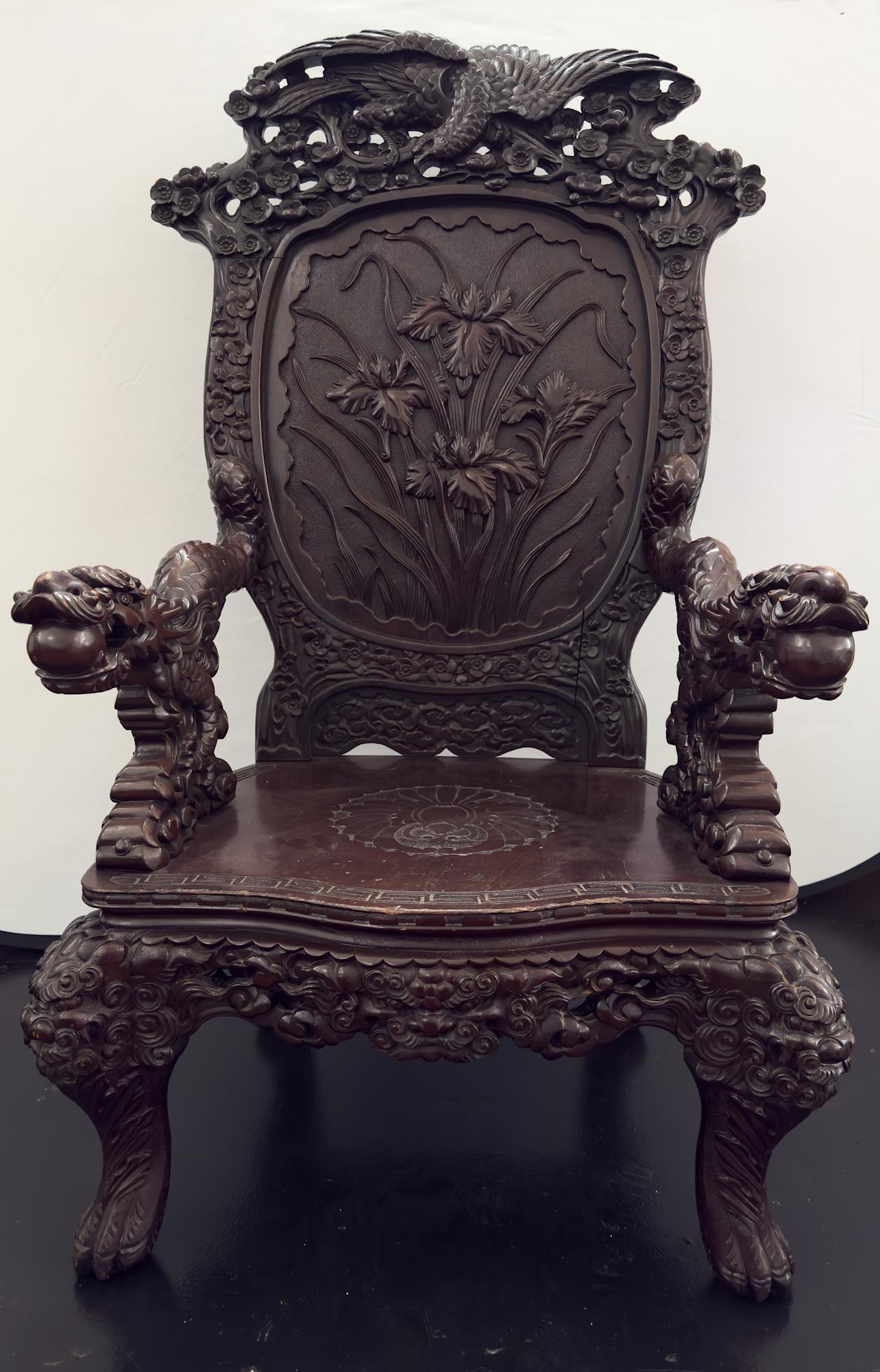 Large wood chair with dragon carved arms, seat back is carved irises. Entire chair is detailed carvings
