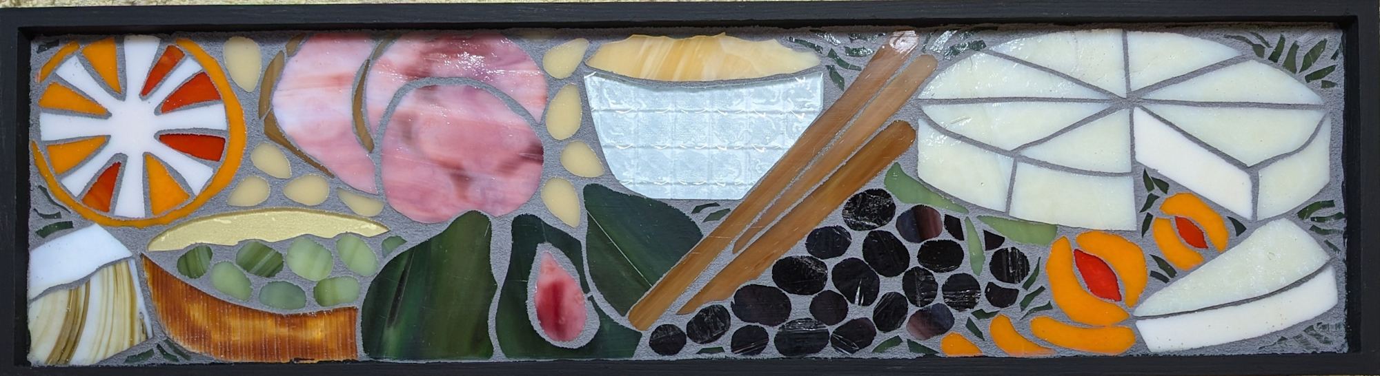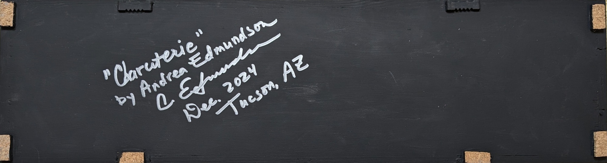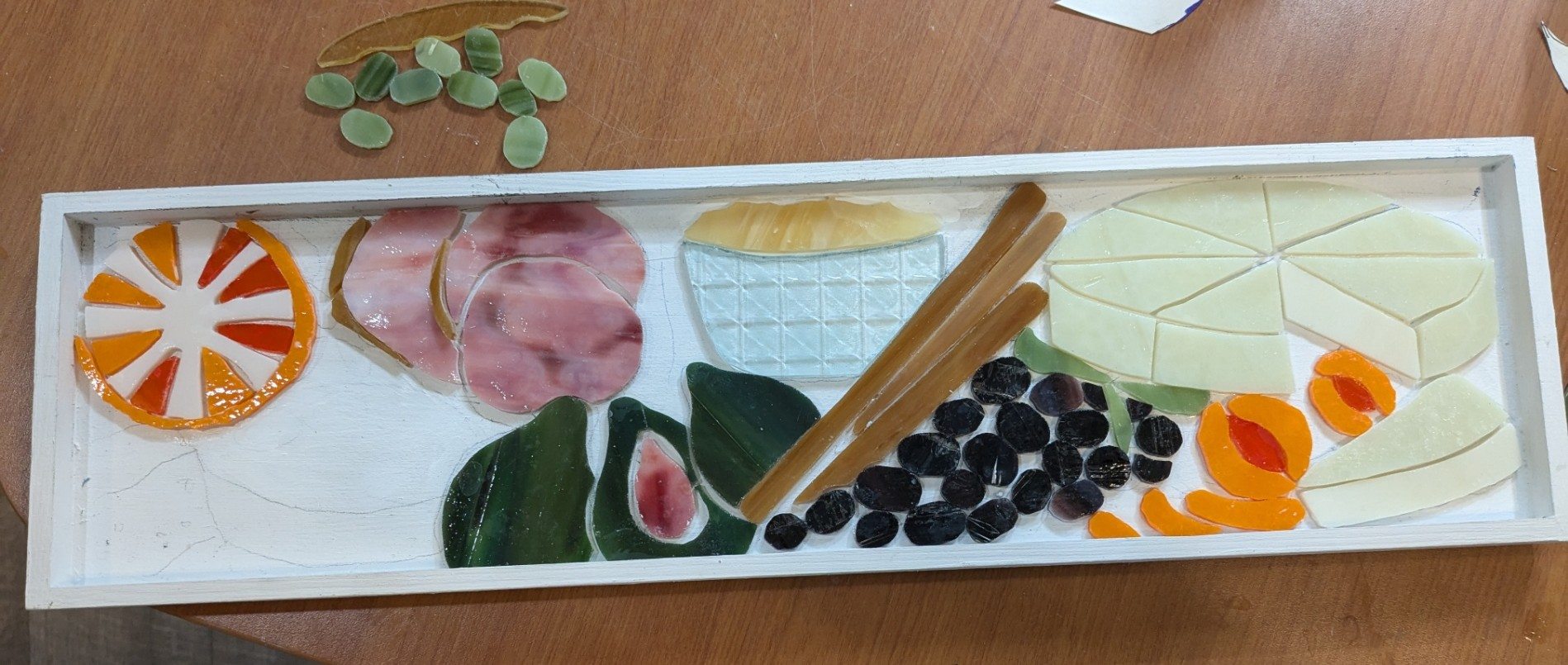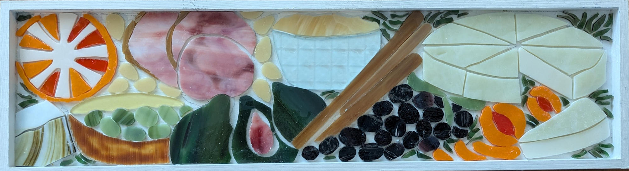 Charcuterie art or board for sister: Cheese round and wedge, almonds, figs, green olives in bowl, black grapes, hummus in bowl, bread sticks, orange slice, apricots, sliced ham, another cheese.