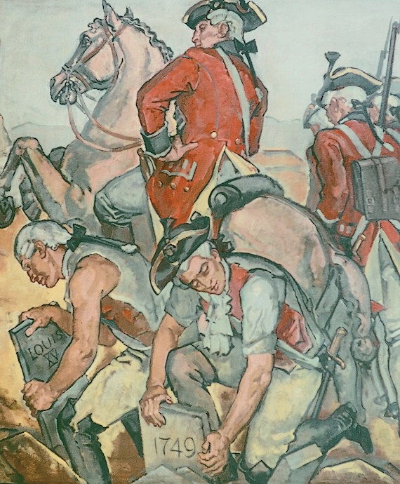 In the second panel, Céleron de Bienville takes possession of the territory now known as Ohio, burying leaden tablets in the Ohio River. In the summer of 1749, Celeron (or Celoron) de Bienville of France traveled from Montreal to the headwaters of the Ohio River (present-day Pittsburgh) and proceeded down the river. He carried with him several lead plates with French pronouncements that lay claim to the Ohio Country. After burying a tablet at every major river confluence, he hung a metal plaque on nearby trees declaring the tablets’ presence.