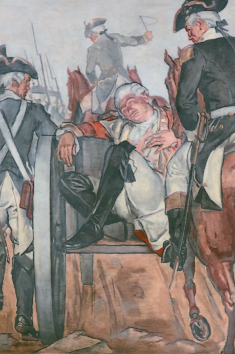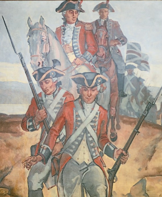 The fourth panel depicts 1755 Braddock’s Retreat. The event depicted here, more accurately called Braddock’s Defeat, was a major victory by American Indians and their French allies over English and Colonial forces during the French and Indian War. Of the 1,400 English men involved in the battle, fewer than 500 escaped alive and unwounded. Mortally wounded, Braddock died four days after the battle. While the English lost this early skirmish, they eventually won the war, driving the French from North America.