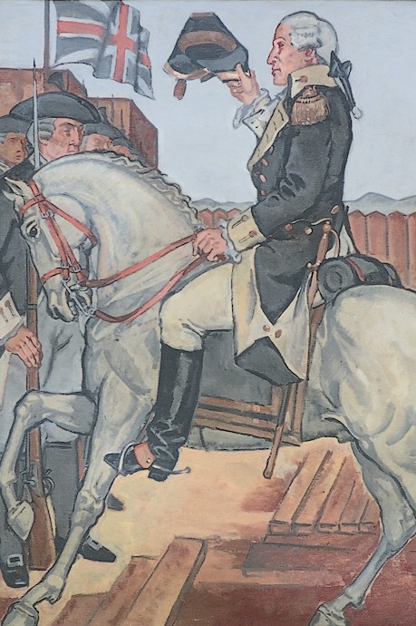 The fifth panel depicts Washington raising the British flag at Fort Duquesne. The theme of this mural is largely symbolic. While George Washington was part of an attempt to capture Fort Duquesne from the French, the effort was unsuccessful, and the scene depicted here never occurred. The French also captured several other English settlements in western Pennsylvania. France seized the land claimed by the English and their colonists, which eventually led to the French and Indian War from 1756 to 1763.