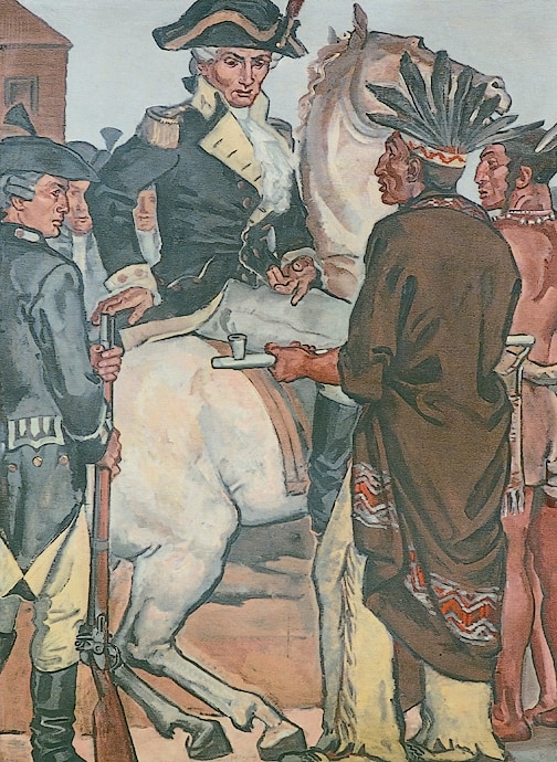 The sixth panel depicts the 1764 Treaty with Chief Pontiac. After waging a series of attacks against English settlements in the Ohio Country in 1763, Pontiac, chief of the Ottawa Indians, ended his rebellion in late 1764. He did not formally surrender to the English (the scene depicted here) until July 1766.