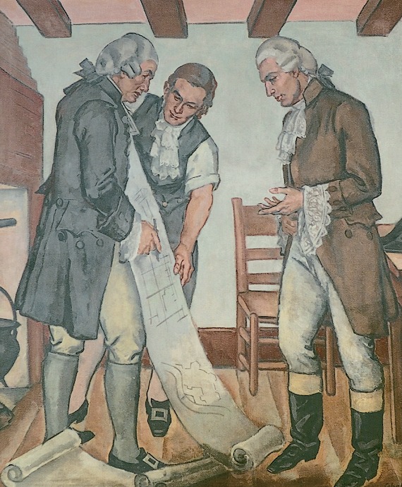 The first panel is the 1788 The Settlement of Marietta. The largest historical painting in the room, located on the rear wall of the Courtroom and facing the bench, honors the founders of Marietta—the first settlement established by the Ohio Company of Associates in the Northwest Territory. The company’s investors named the community after Marie Antoinette, wife of Louis XVI and queen of France, to honor her country’s contribution to the colonists’ victory in the American Revolution. The Northwest Territory’s first governor, Arthur St. Clair, settled in Marietta in 1788. Because of its prime location along the Ohio River, Marietta grew quickly and became a vital trading center for the Northwest Territory and eventually for the state of Ohio. The panoramic painting of the settlement features 13 figures representing the original 13 colonies. In the central foreground, Rufus Putnam, one of the founders of the Ohio Company, confers with St. Clair.