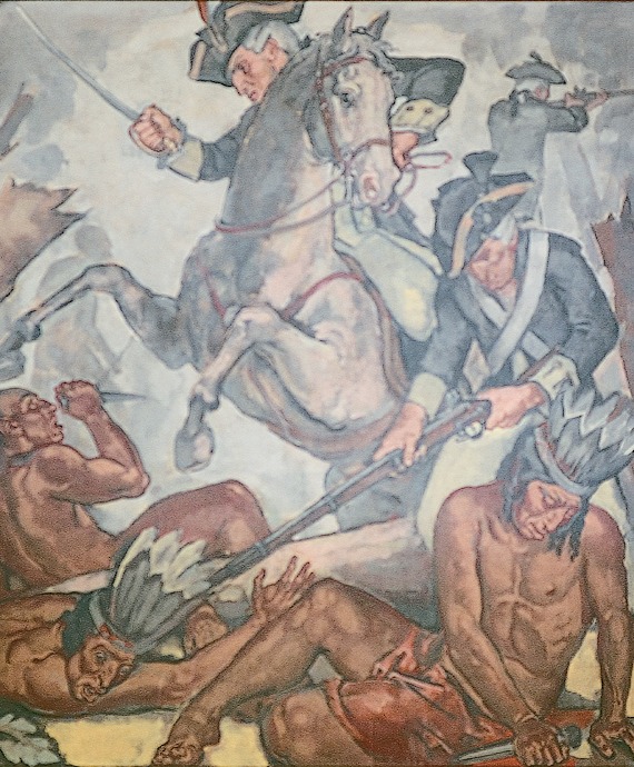 The eighth panel shows the 1794 The Battle of Fallen Timbers. This panel depicts a battle between American Indians and the U.S. Army of the Northwest, led by Commander Anthony Wayne, which took place near the Maumee River. The fight became known as the Battle of Fallen Timbers because a tornado knocked down many of the nearby trees.