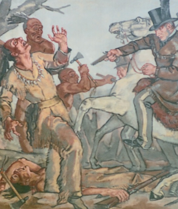 The tenth panel depicts the death of Tecumseh. During the War of 1812, Tecumseh and his followers allied themselves with the British, hoping an English victory would result in a return of the Indian homelands. British troops, however, deserted Tecumseh and his men during the Battle of the Thames, leaving many, including Tecumseh, to die at the hands of American Army troops led by William Henry Harrison.