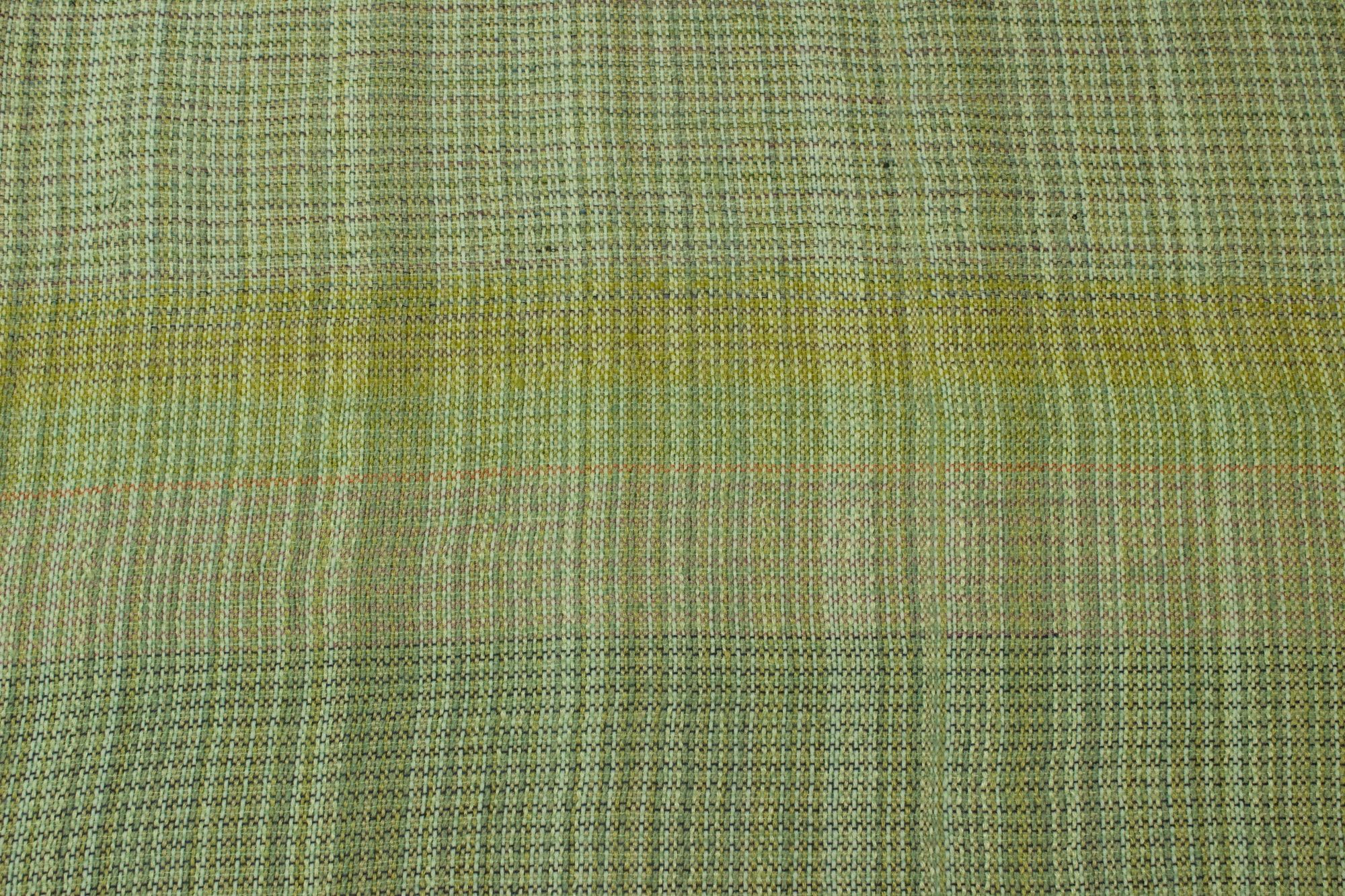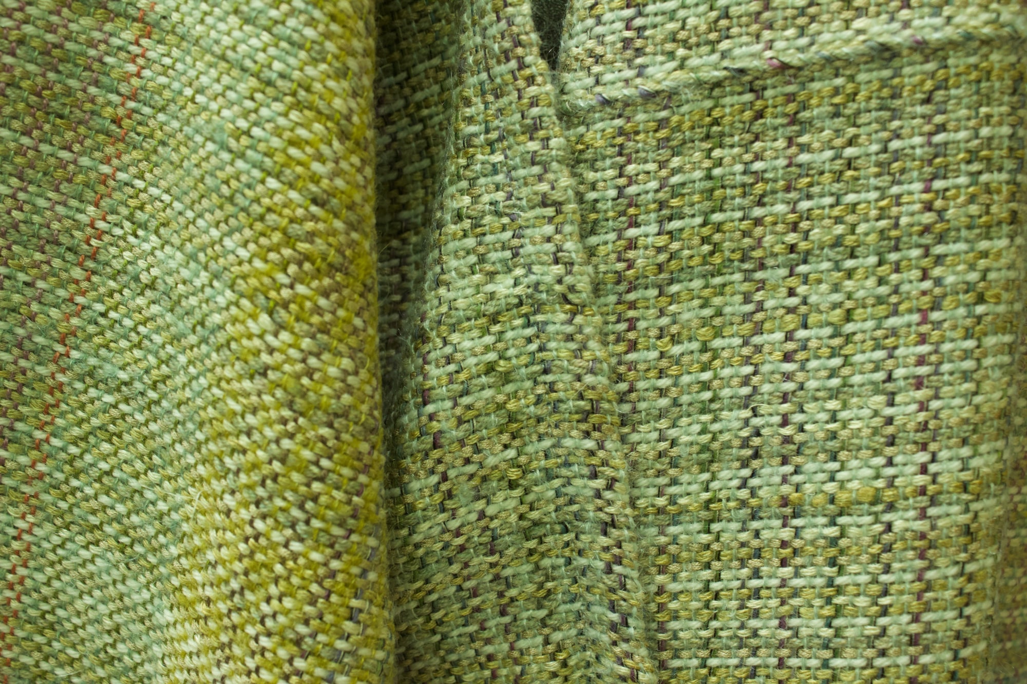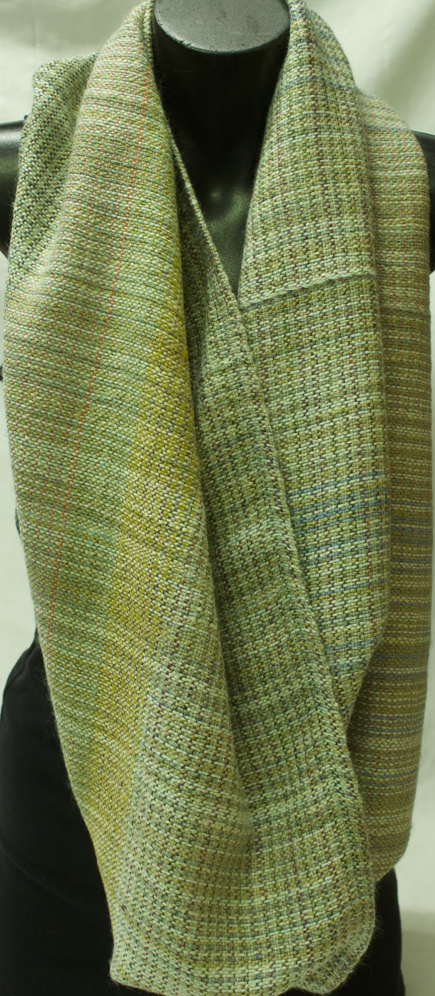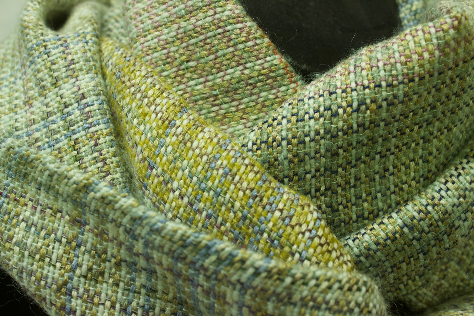 Cowl made from white, beige, grey and blue wool, silk and linen warp, with a multicoloured wool, alpaca and mohair weft.