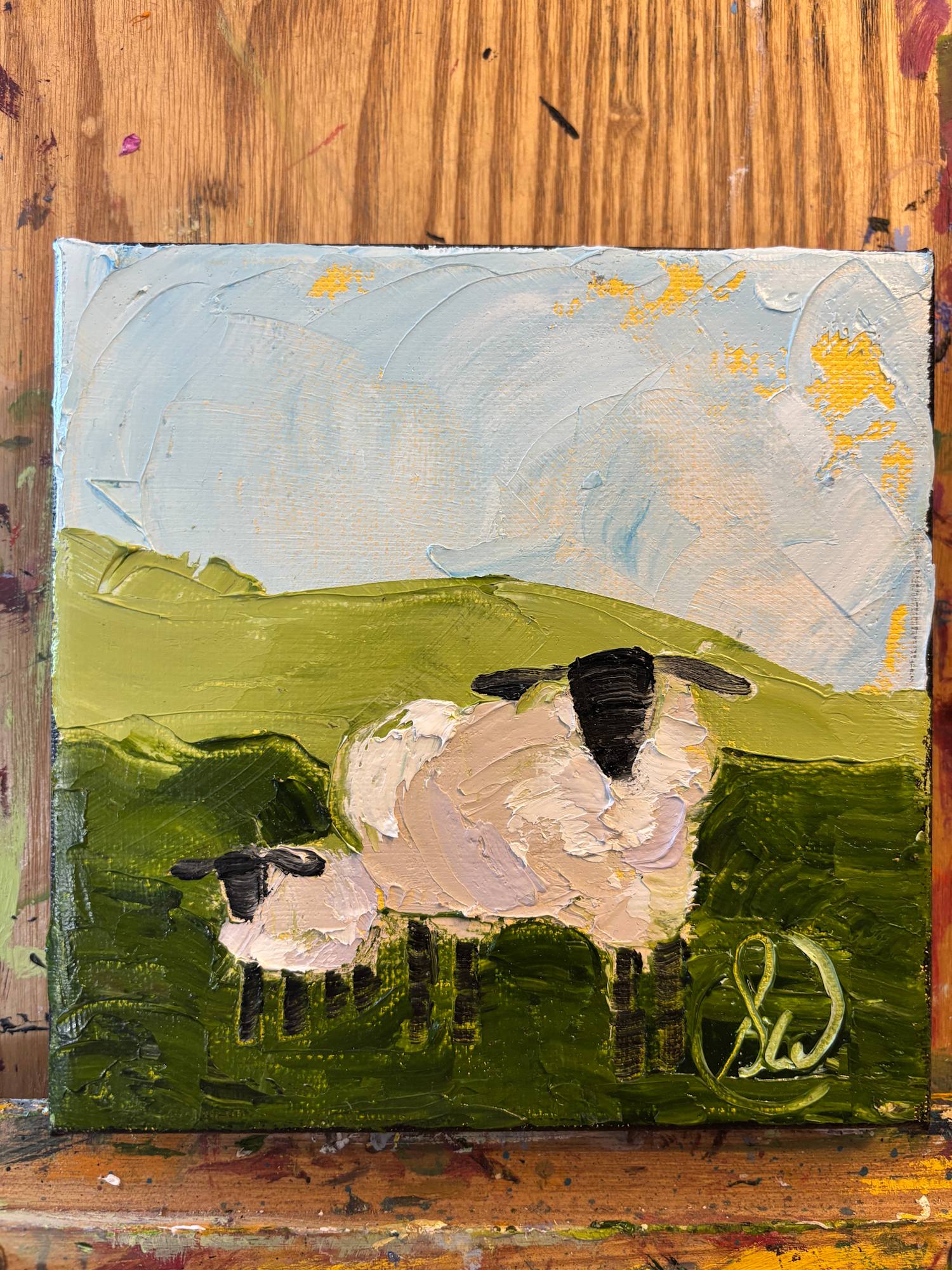 Sunny hillside with a sheep and lamb. Oil painting in abstract expressionism style.