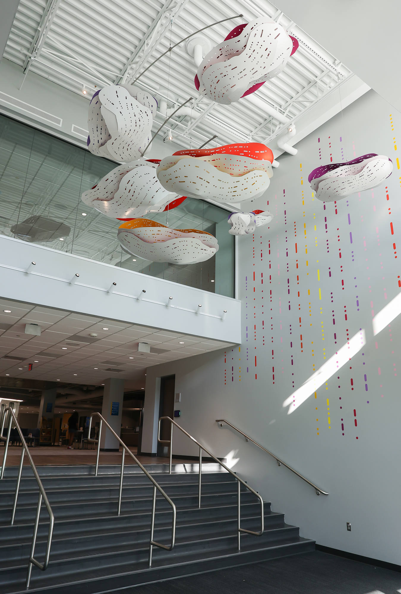 cumulate’s visual language highlights the beauty and role of clouds in the Nebraska landscape interlacing it visually, audibly, and tangibly with the work of Nebraska poets, evoking the beauty of the Nebraska landscape and its people. Through this rich gathering of meaning, material, and content, cumulate merges the physical, the digital and the ephemeral. By creating vistas for the viewer and multiple paths for exploration, cumulate provides a place of visual rest and avenues of creative curiosity within the Calvin T. Ryan Library.