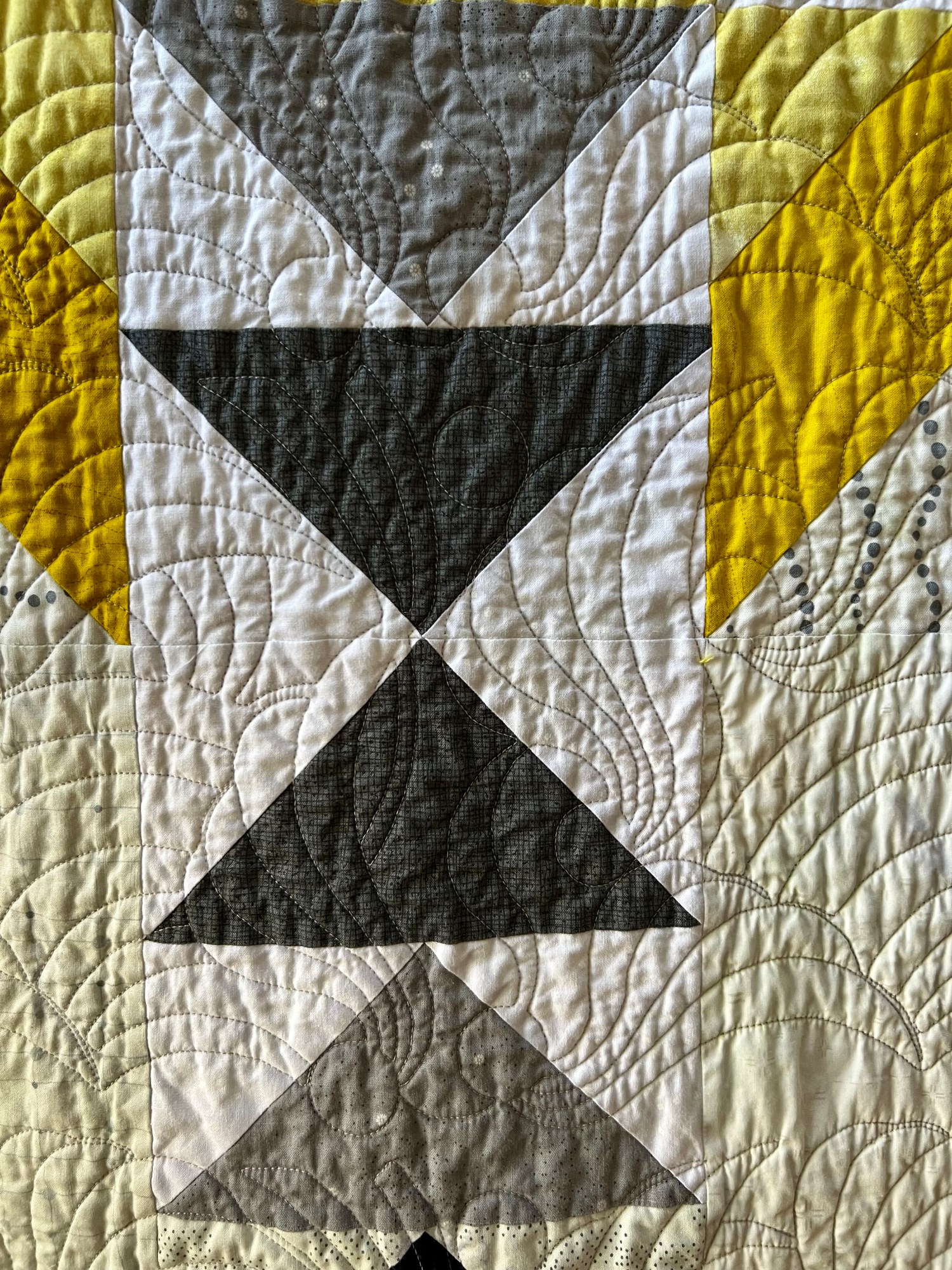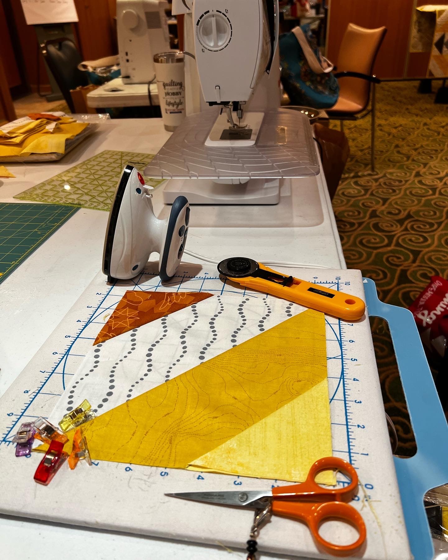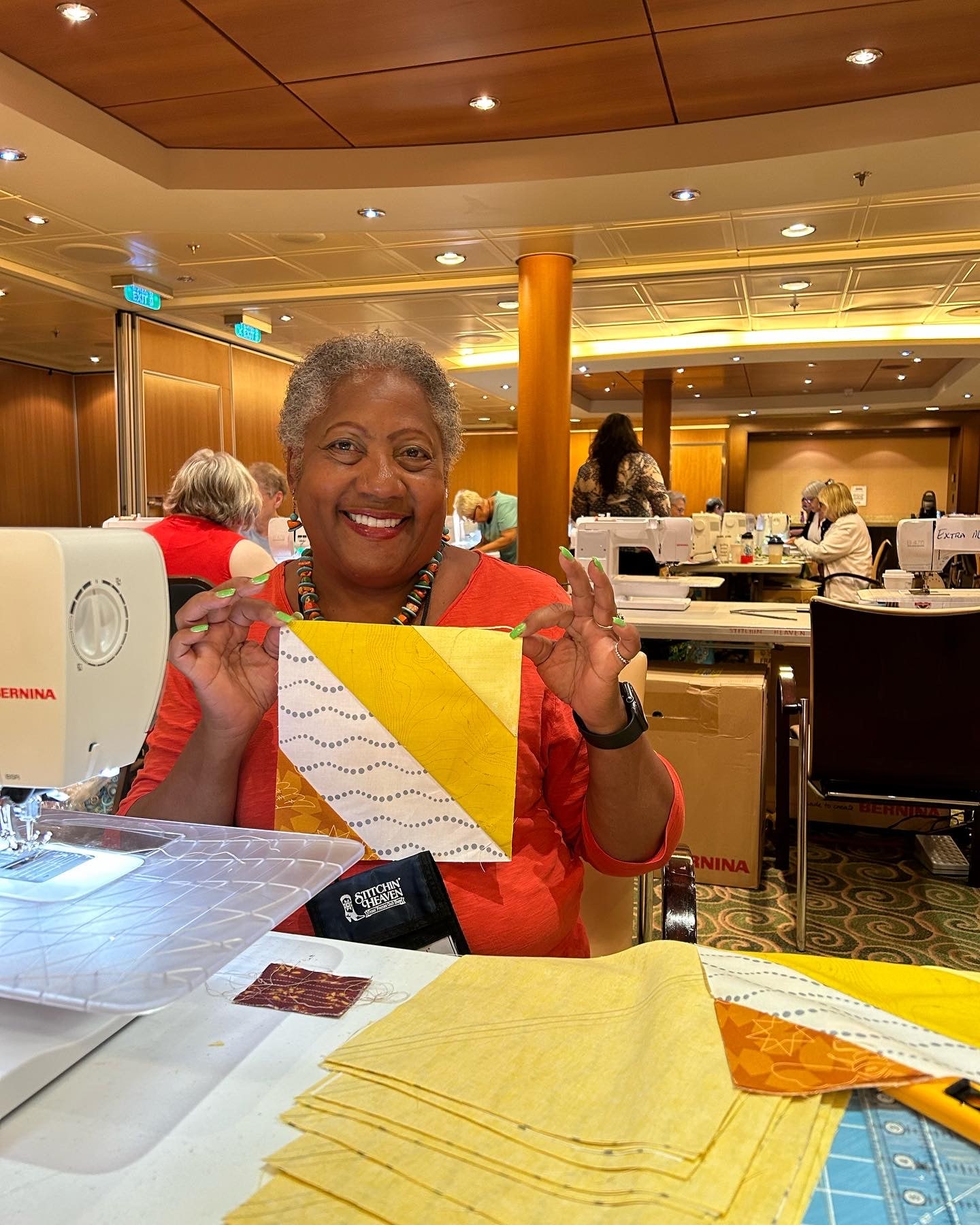 During the cruise, we took quilt classes, and this quilt is the result of a class taught by Sherri Noel. She chose the pattern and the fabric. The pattern which is named “Flying Free” is a happy quilt with big pieces that go together quickly. I love yellow quilts.