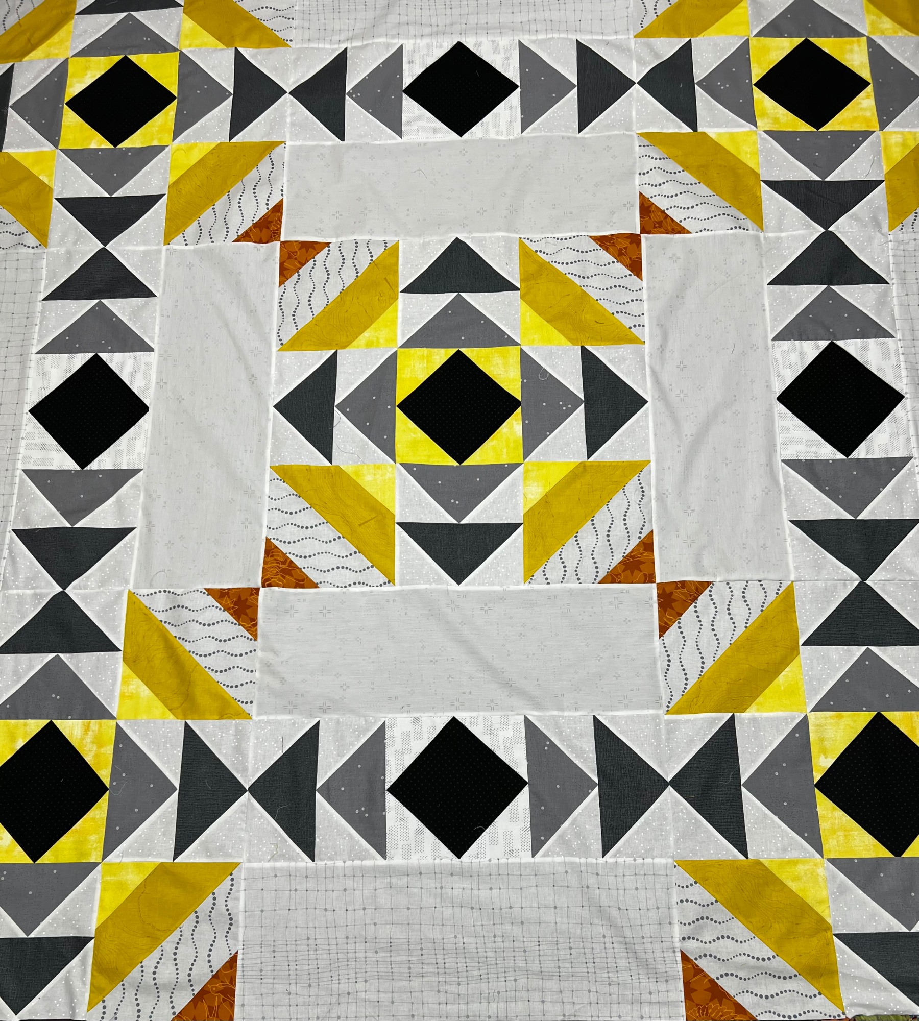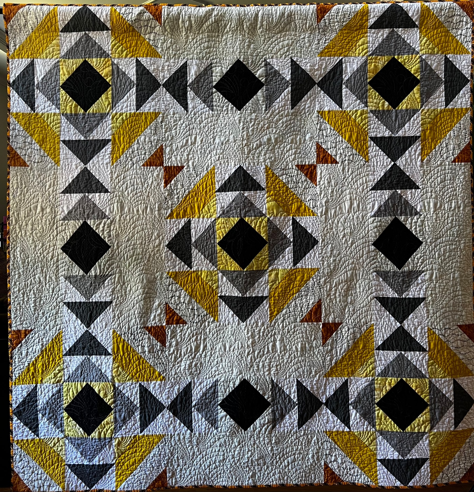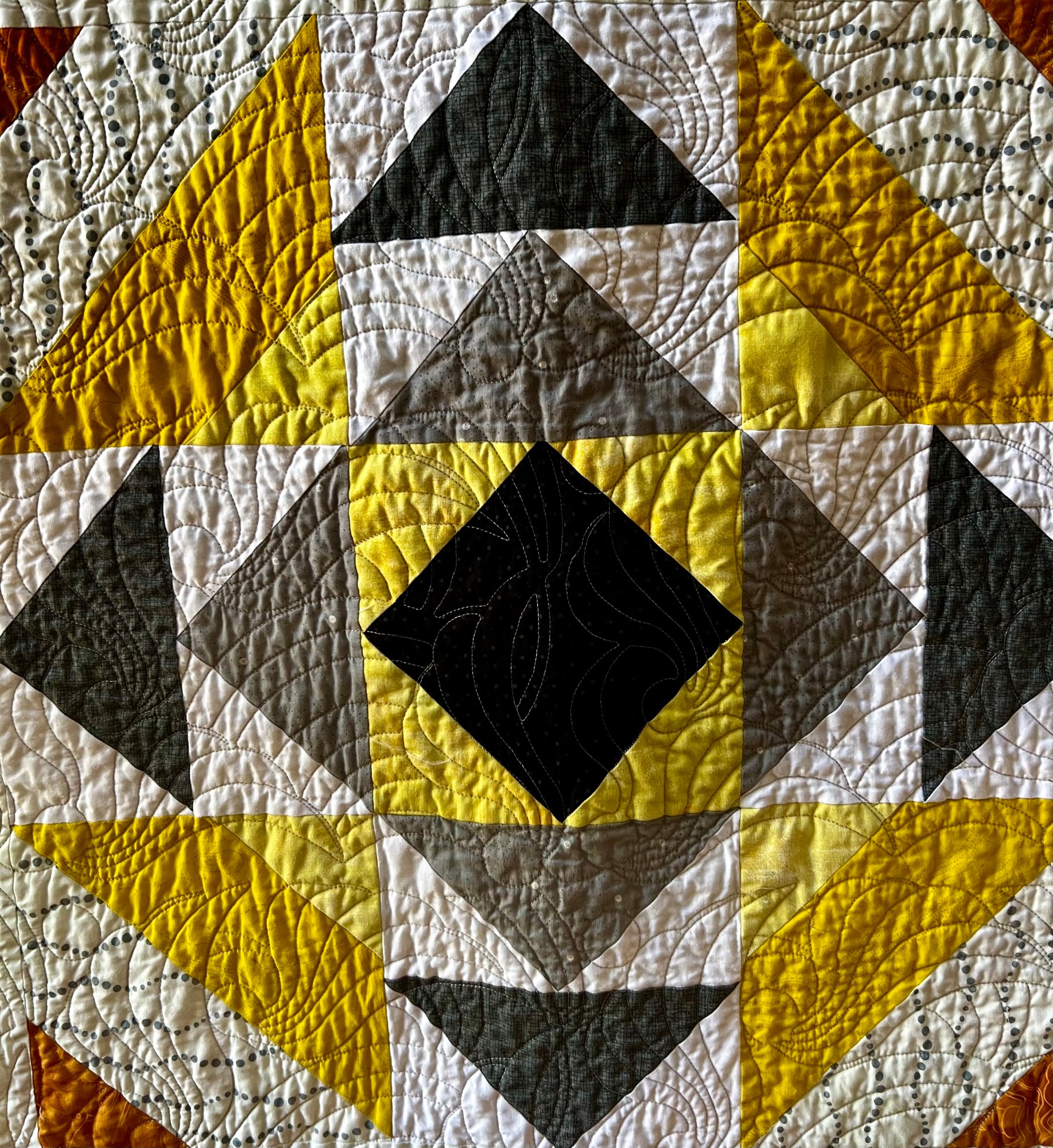 During the cruise, we took quilt classes, and this quilt is the result of a class taught by Sherri Noel. She chose the pattern and the fabric. The pattern which is named “Flying Free” is a happy quilt with big pieces that go together quickly. I love yellow quilts.