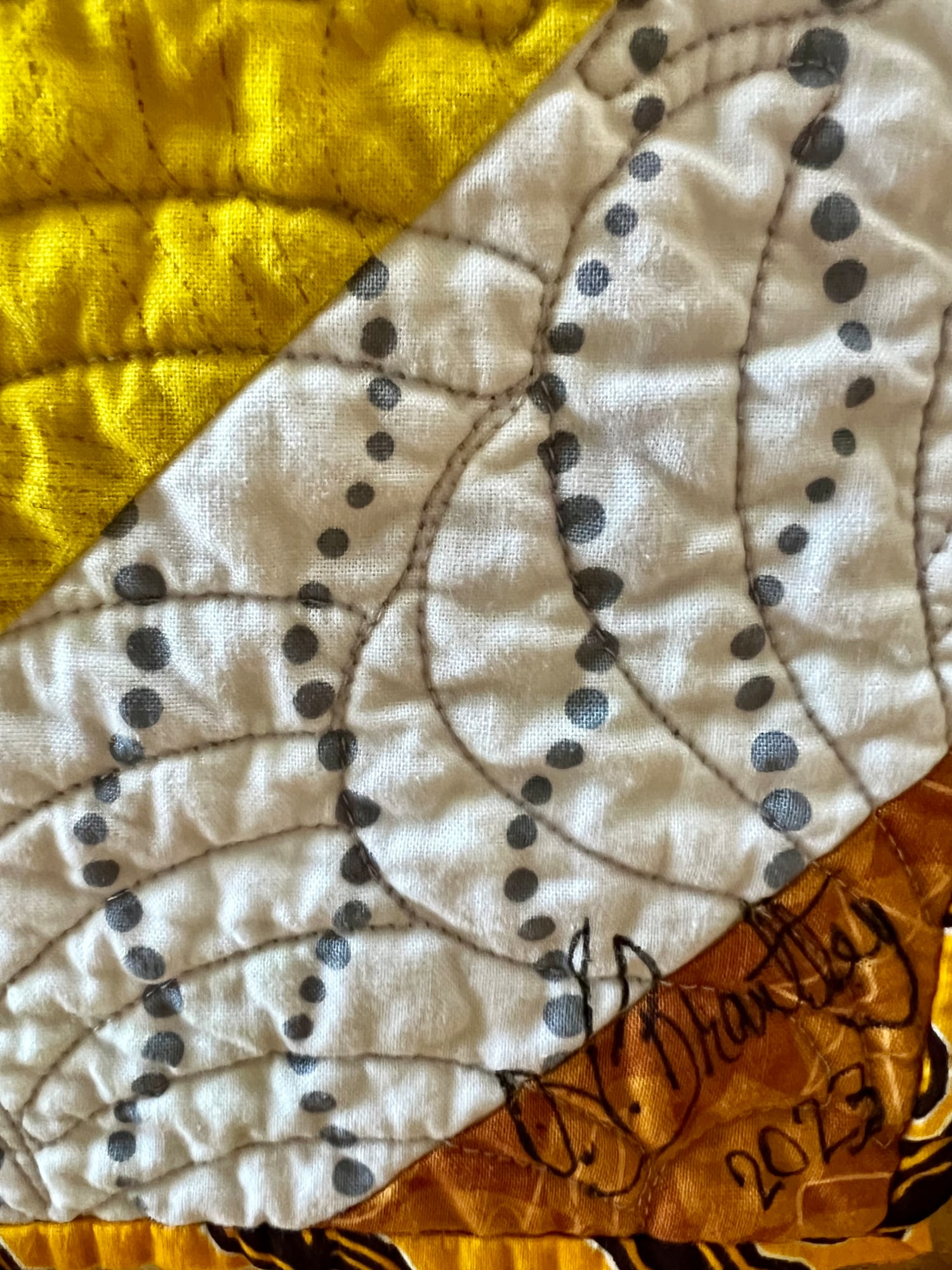 The fabric on the back of the quilt is a bright green and yellow African print. I try to add African fabric to my quilts whenever I can. There is a hanging sleeve on the back for easy display and a label that documents the quilt. I signed it on the front.