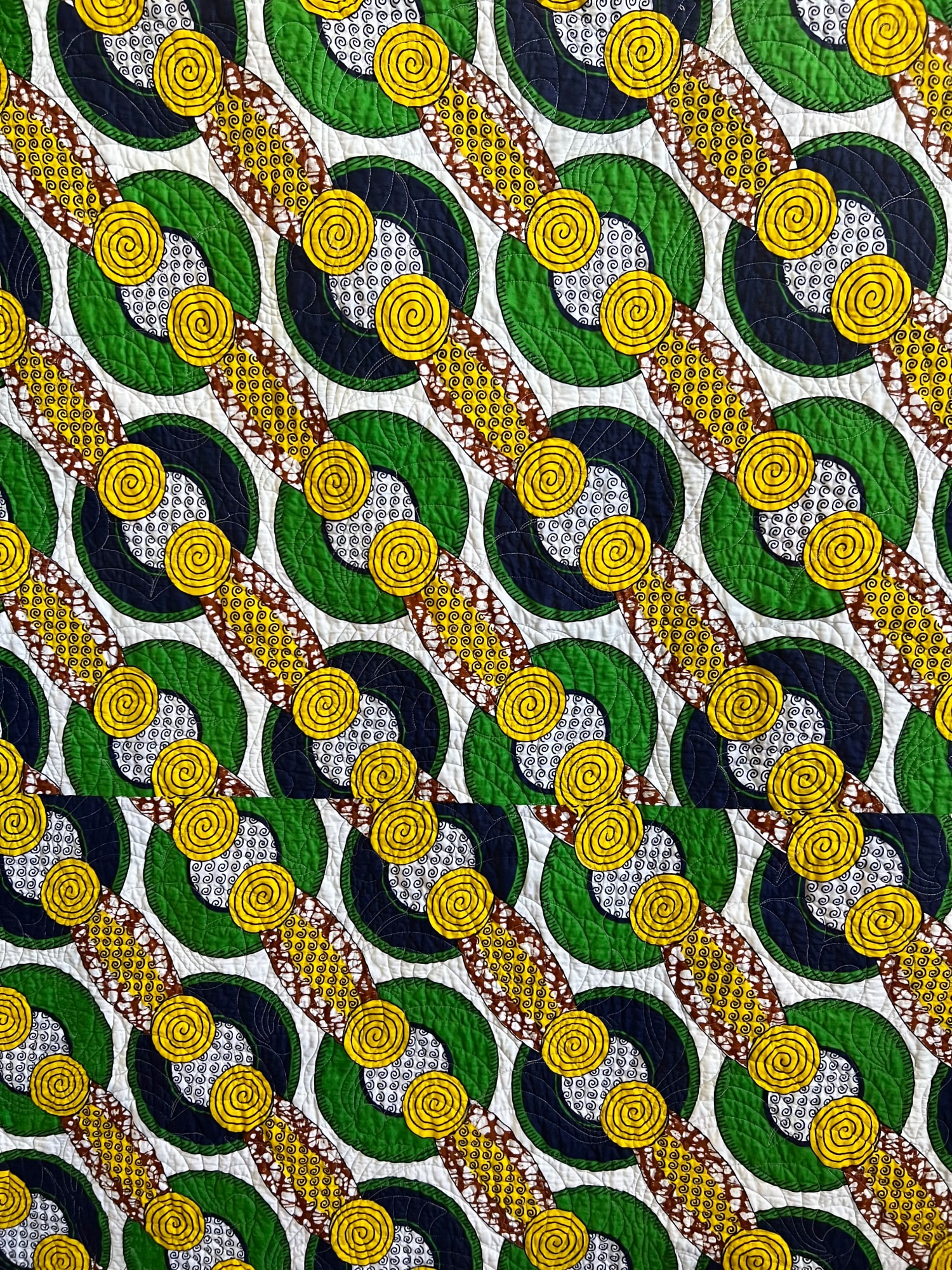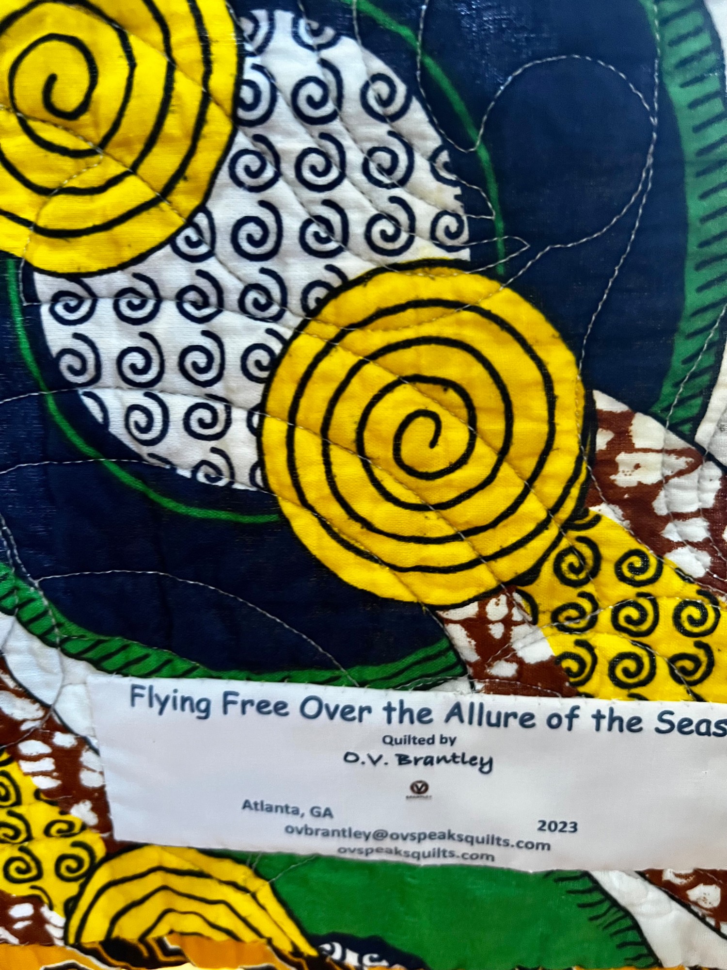 “Flying Free Over the Allure of the Seas” measures 68 X 68 inches. It is machine pieced and quilted with hand sewn binding in a yellow African print. Maxine Moore did the beautiful machine quilting on her long arm machine.
