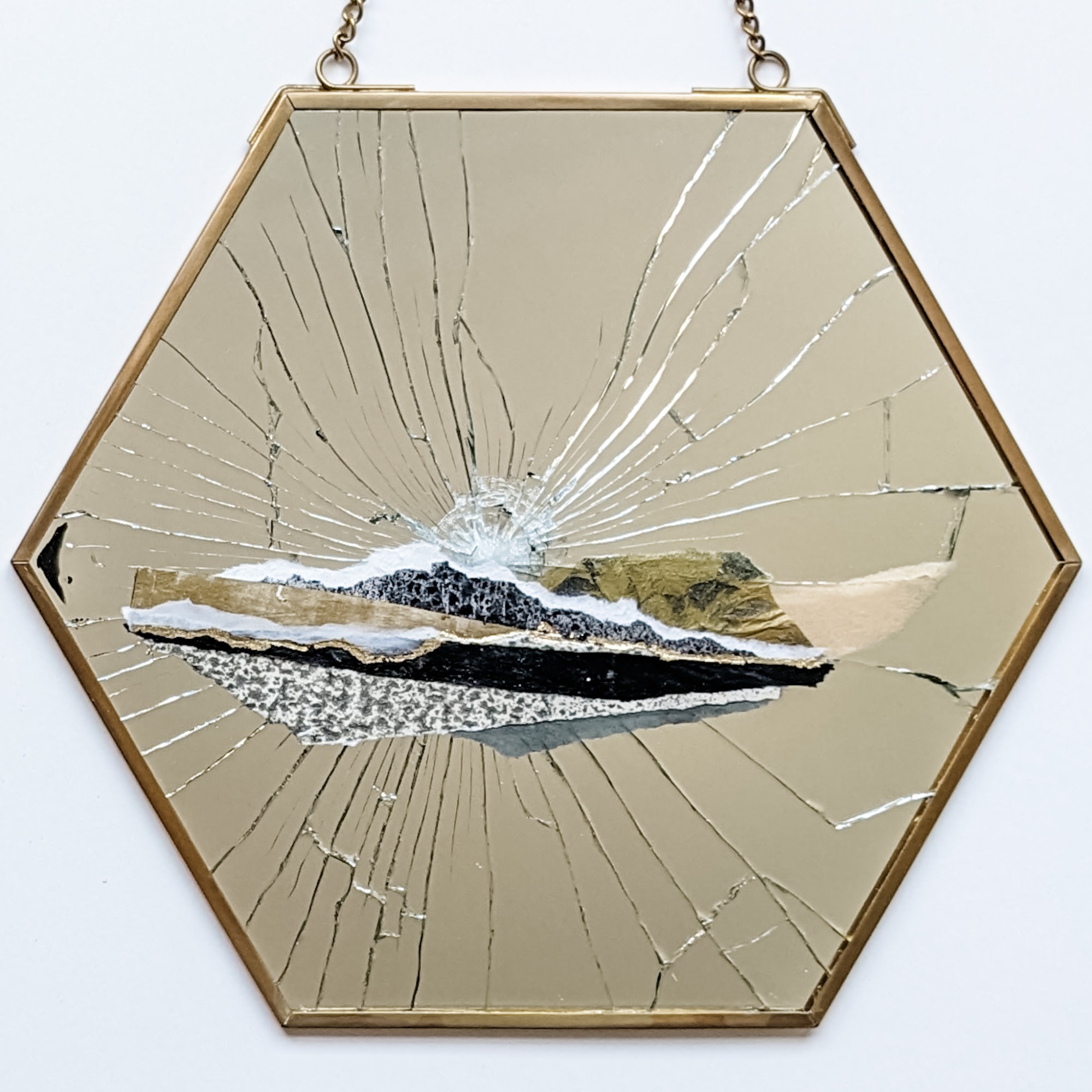 An abstract mountain landscape composed using torn paper, repurposed artwork, and delicate gold leaf. The artwork is showcased on a fractured mirror within a brass frame, and it is coated with epoxy for protection. Please exercise caution when handling. 4-inch chain for hanging brings the total height to 12.25 inches.