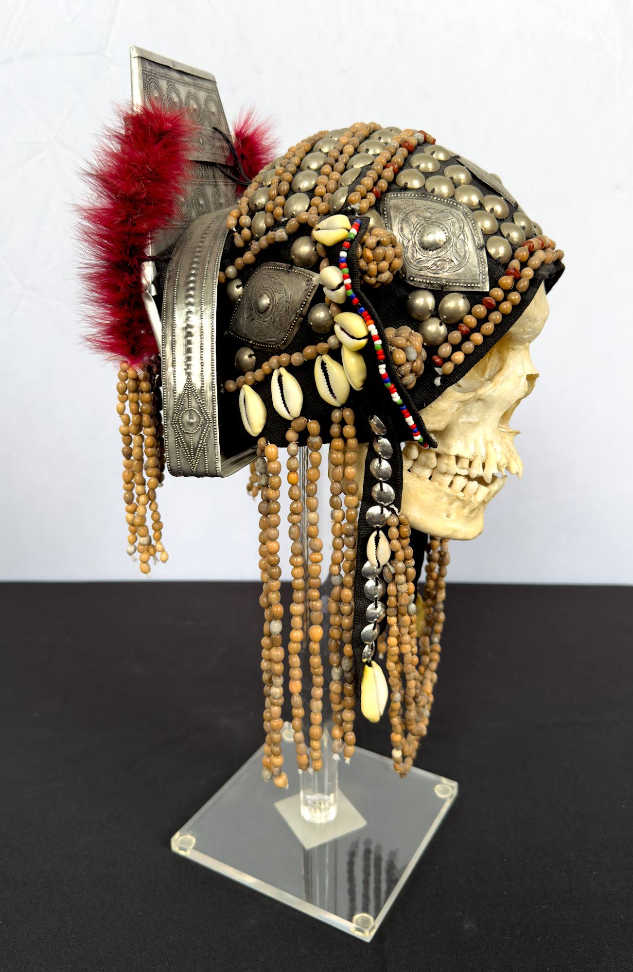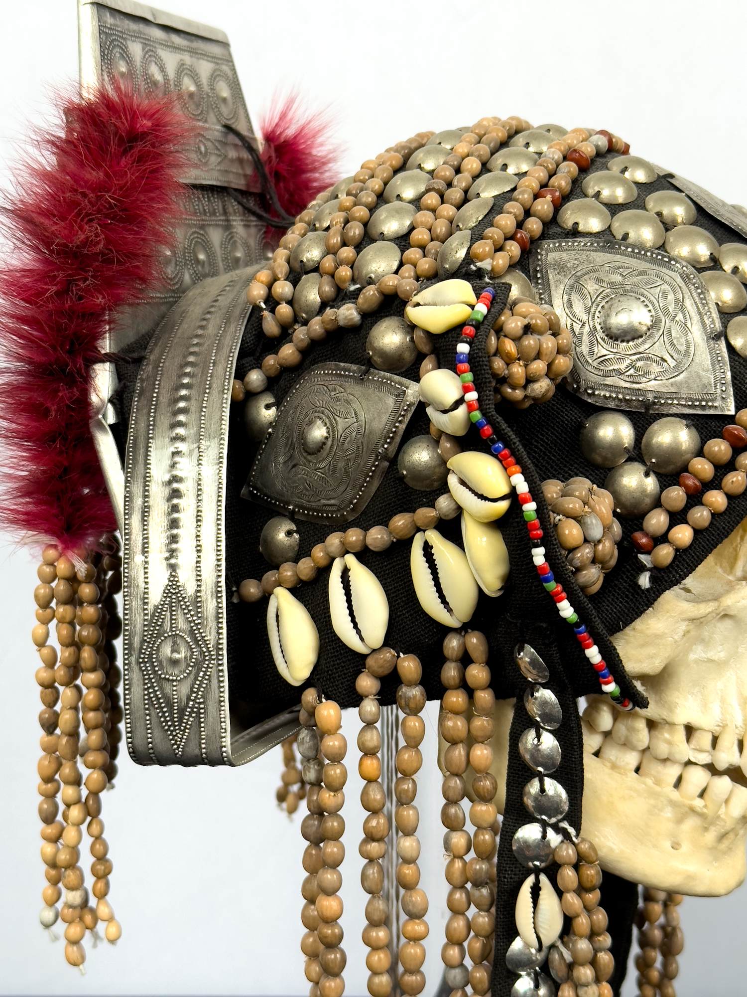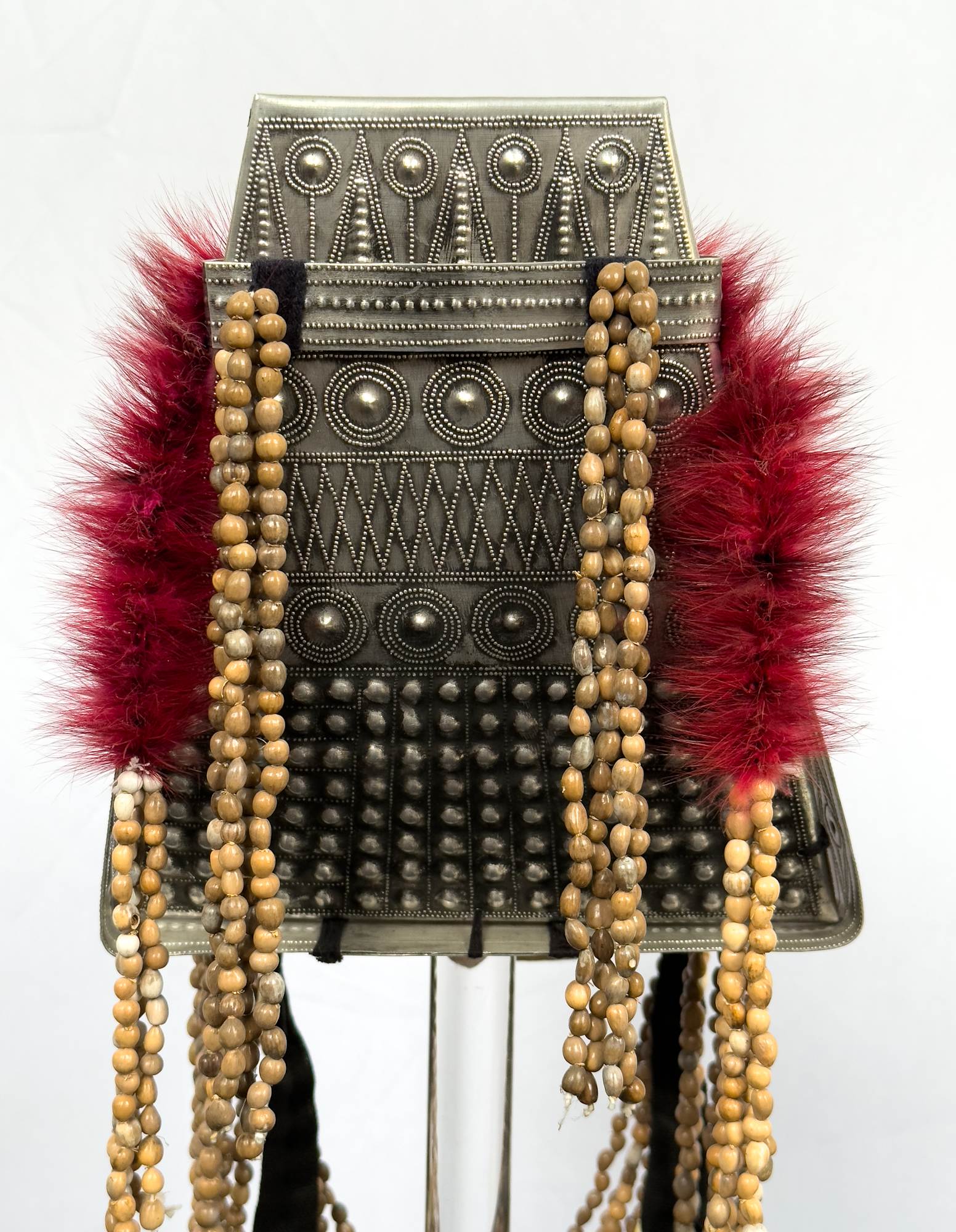 Head dress is made up of metal, beads, shells and fur.