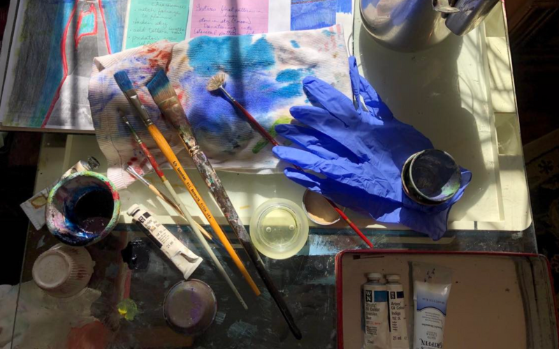 Early morning view of the worktable of Artwork Archive artist Krista Machovina. Photo courtesy of the artist