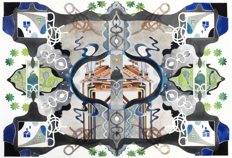 Her compositions are layered and labyrinthine, shaped by recurring visual motifs (spheres, light rays, towers, and bars) all tied to personal significance. These forms show up across her work like familiar markers, creating a visual rhythm that ties everything together.