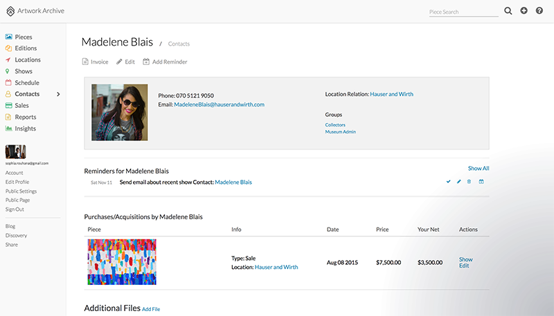 Then you can add in important business contacts so you have the details of your art collectors, gallery owners, interior designers, museum curators, and art fair directors all in one place. That way you can access them anytime, anywhere as well as connect them to specific pieces within your inventory. You can keep them updated on your art career and mail personal thank you notes to your best buyers.