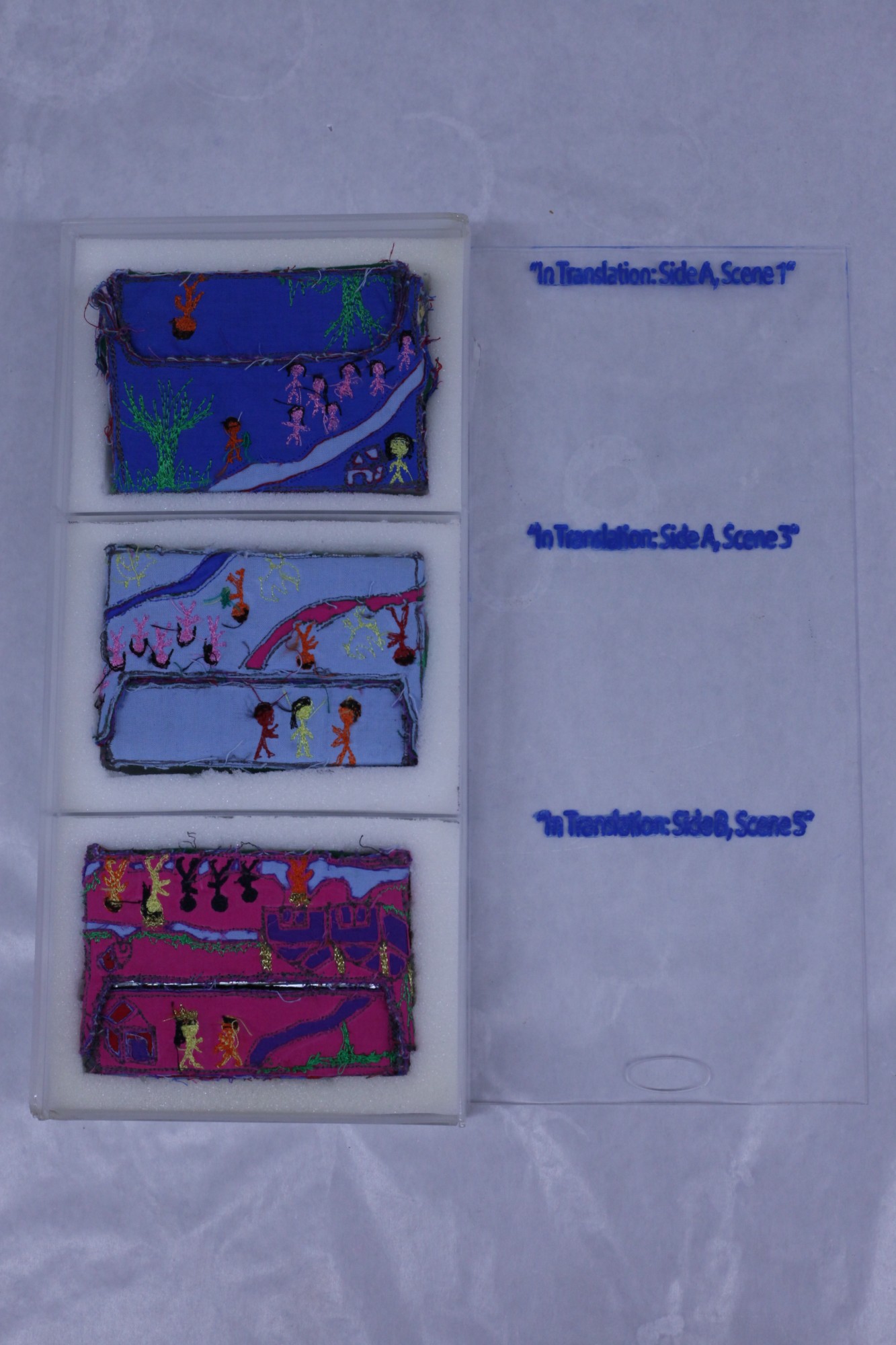 A fabric, embroidered cassette tape. The tape holder is decorated with bright colored thread and fabric. The embroidery depicts humans and environmental symbols, acting out the scenes discussed on the tape. On the inside of the case, text is embroidered relating to the story told on the cassette tape. See scanned artist's statement for more information.