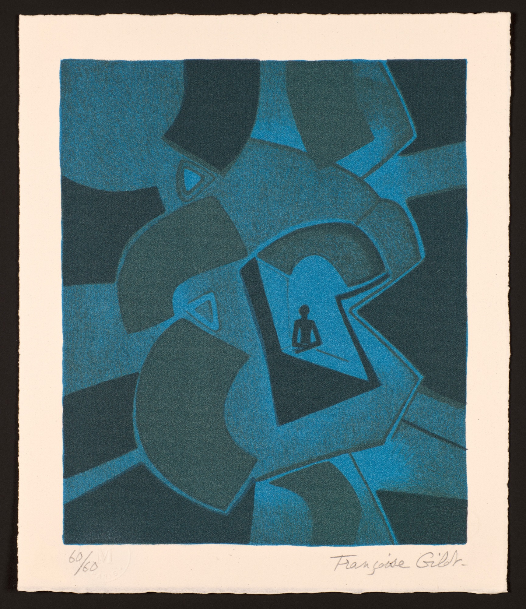 person outlined in window- printed in three colors. Blue, warm gray and blue gray