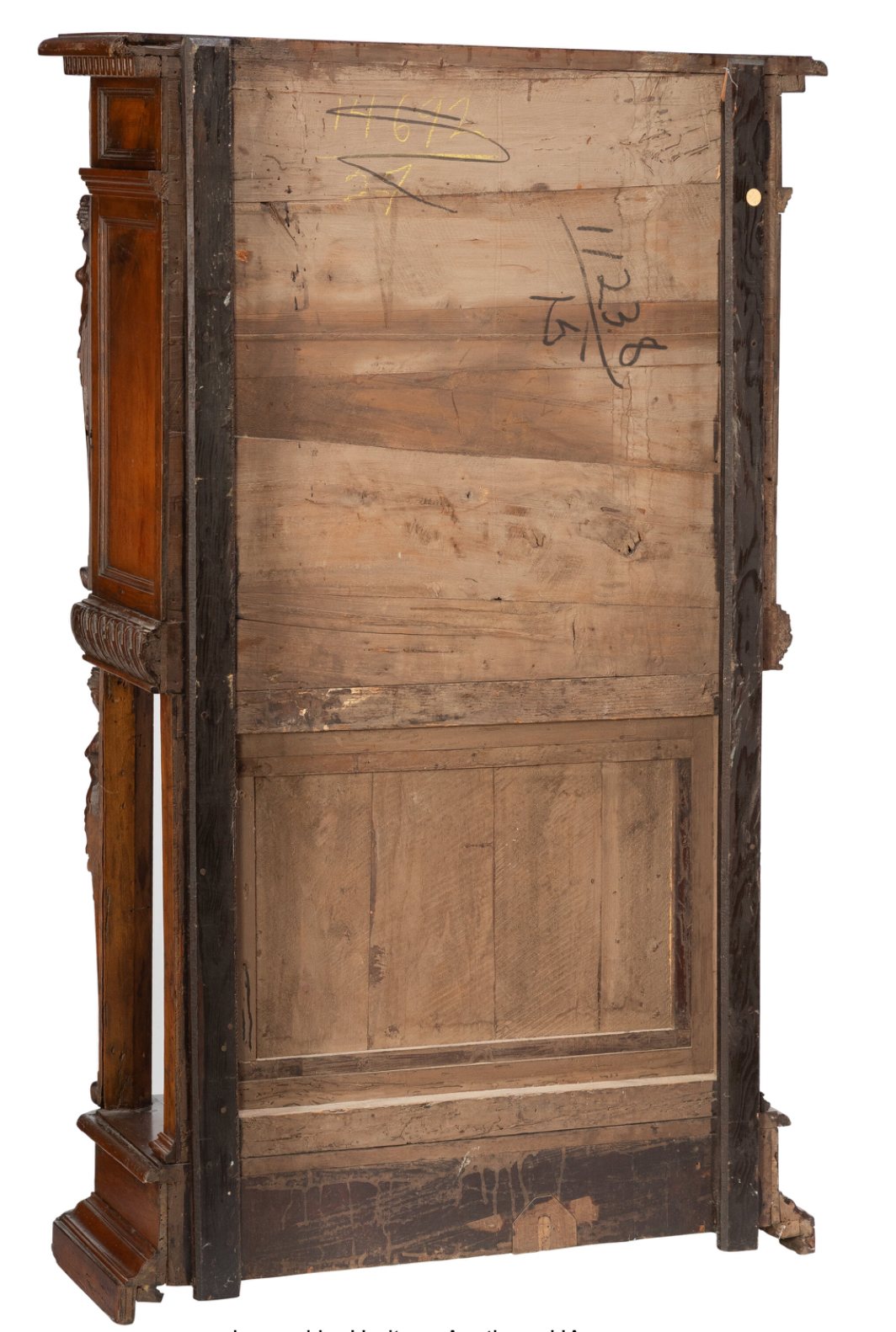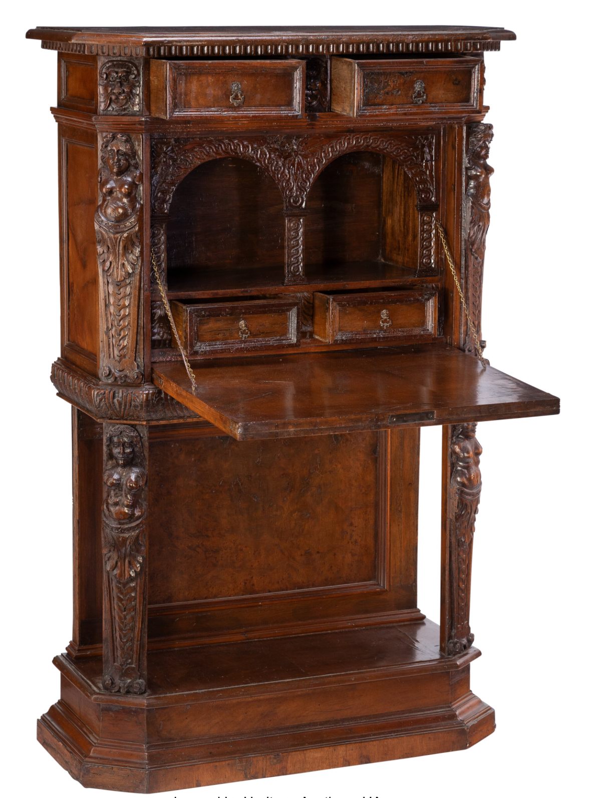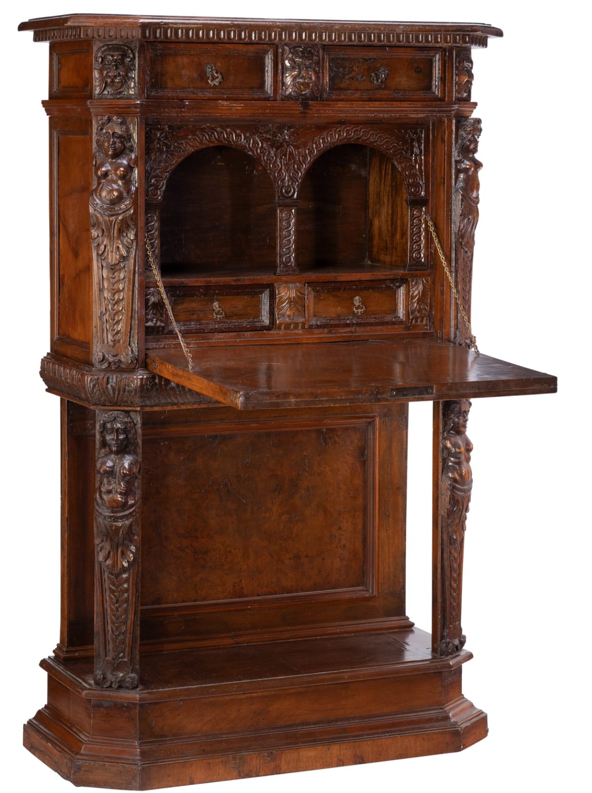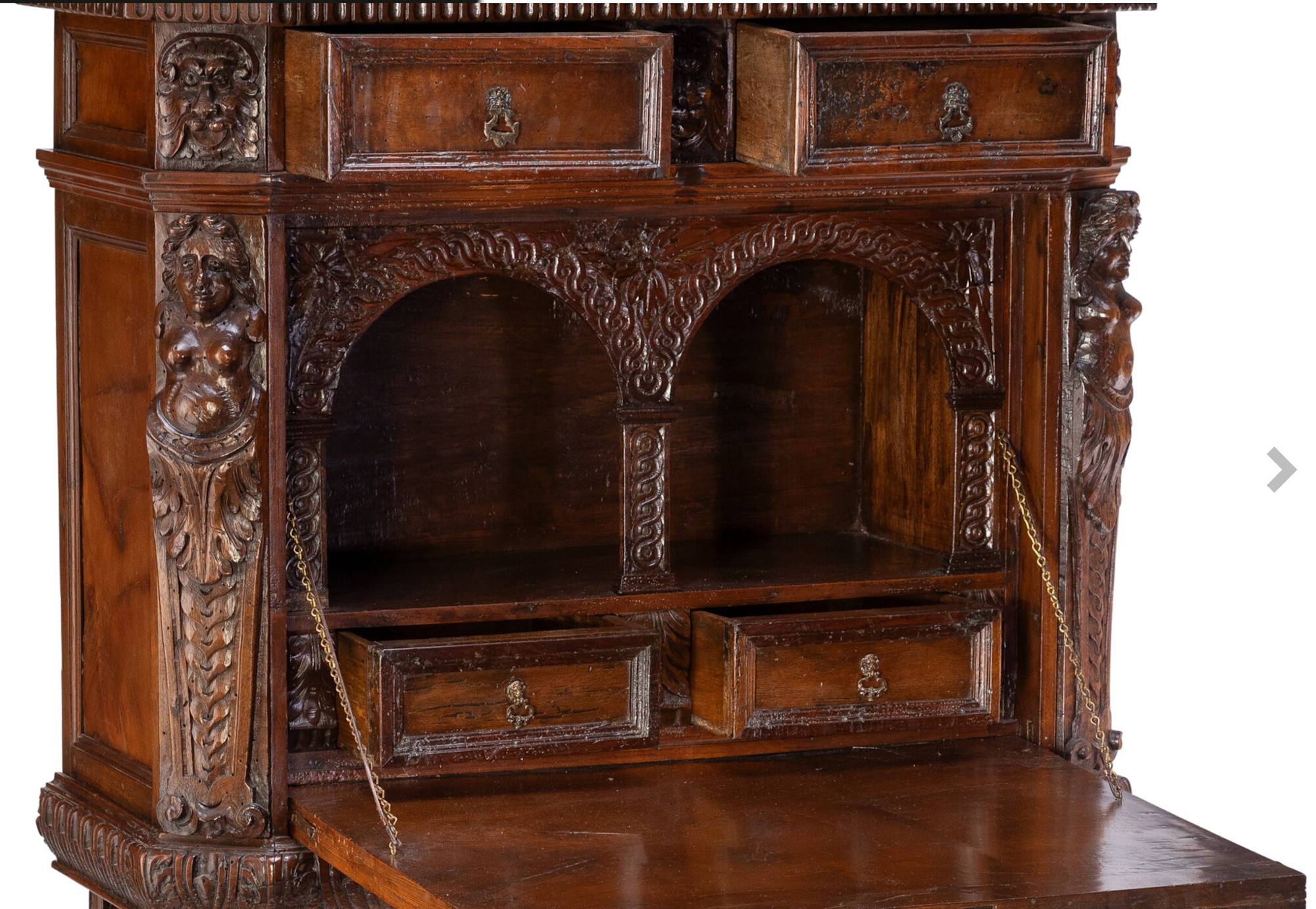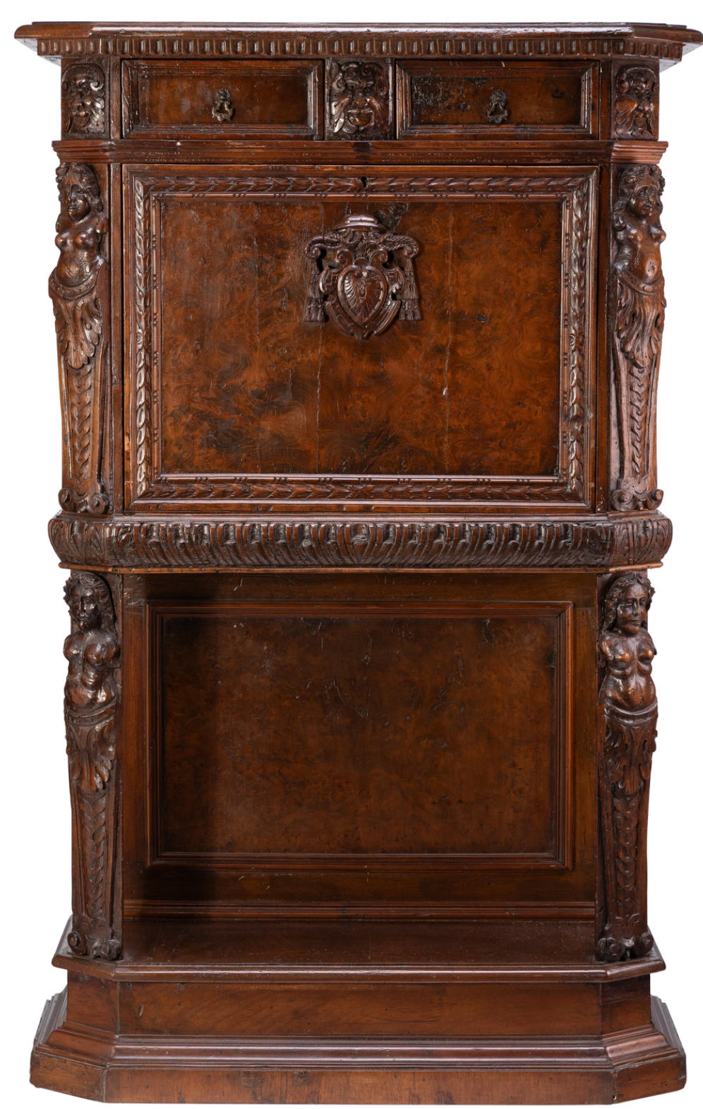 The Rectangular top over frieze drawers divided and flanked by of Grotesques above a hinged fall front centering on an ecclesiastical Herald carved with Galero issuing Savoy nodded ropes, suspending, tassels opening to Arcaded document dividers, flanked by terms raised on term supports on a step base