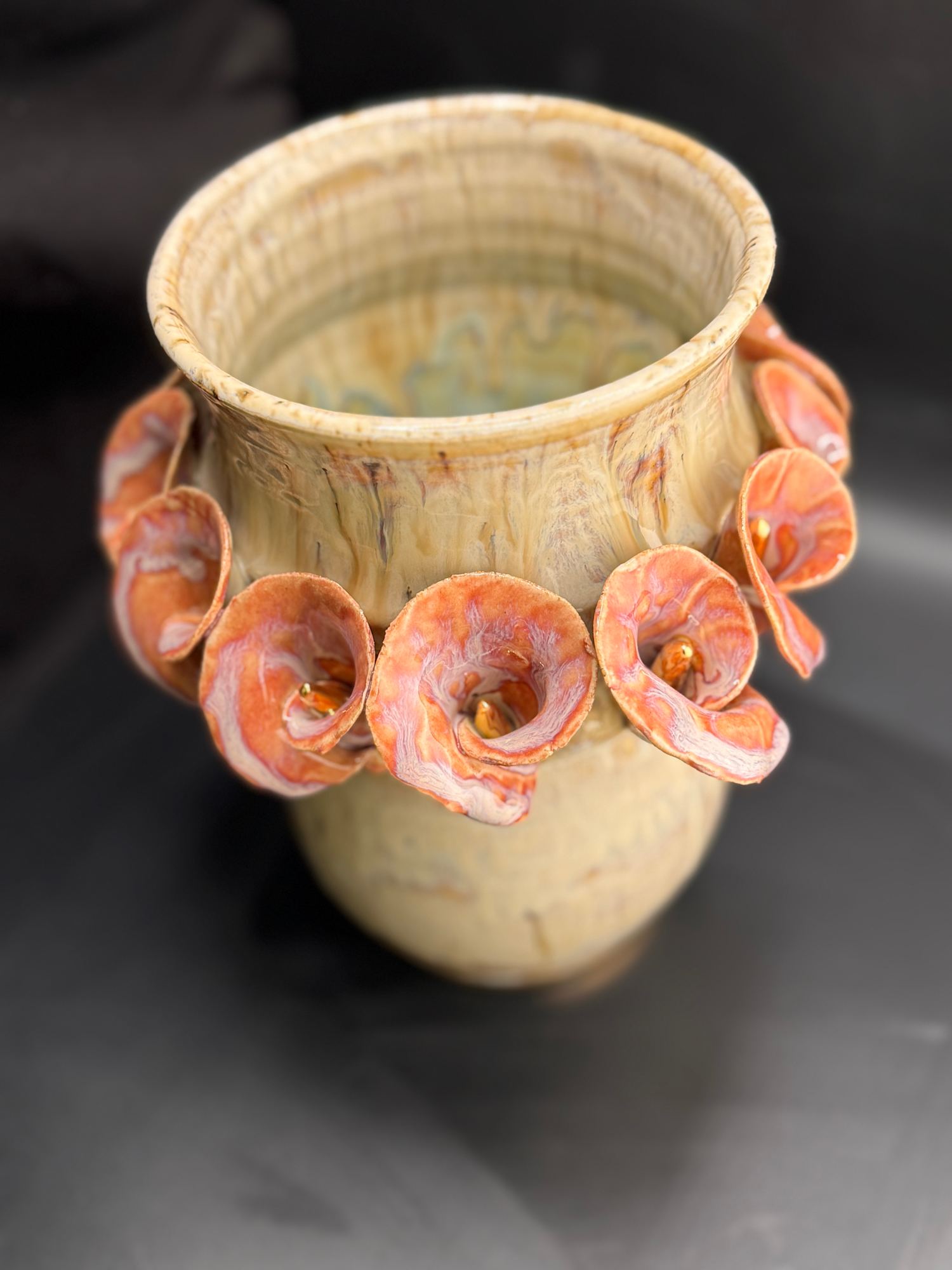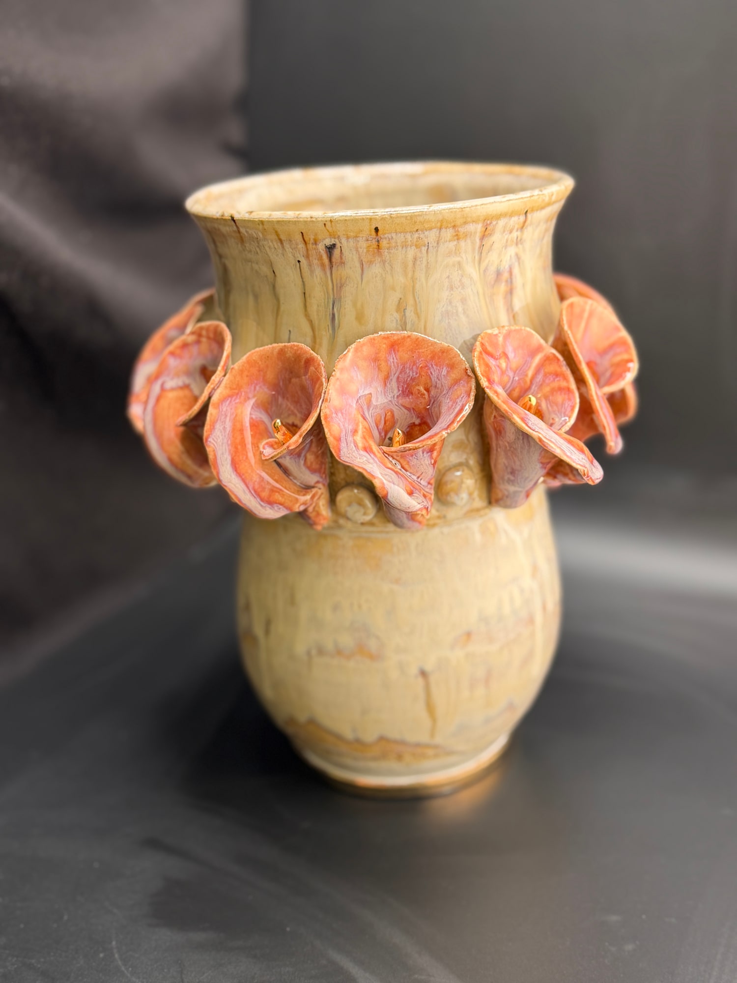 Wheelthrown vase adorned with handmade lilies all around. Glazes have been brushed by hand and then fired to over 2000 degrees Fahrenheit. After this firing, each lily’s stamen was carefully painted with a 22k gold luster glaze and refired to achieve the golden accents. A band of gold was also applied to the base of this vase.