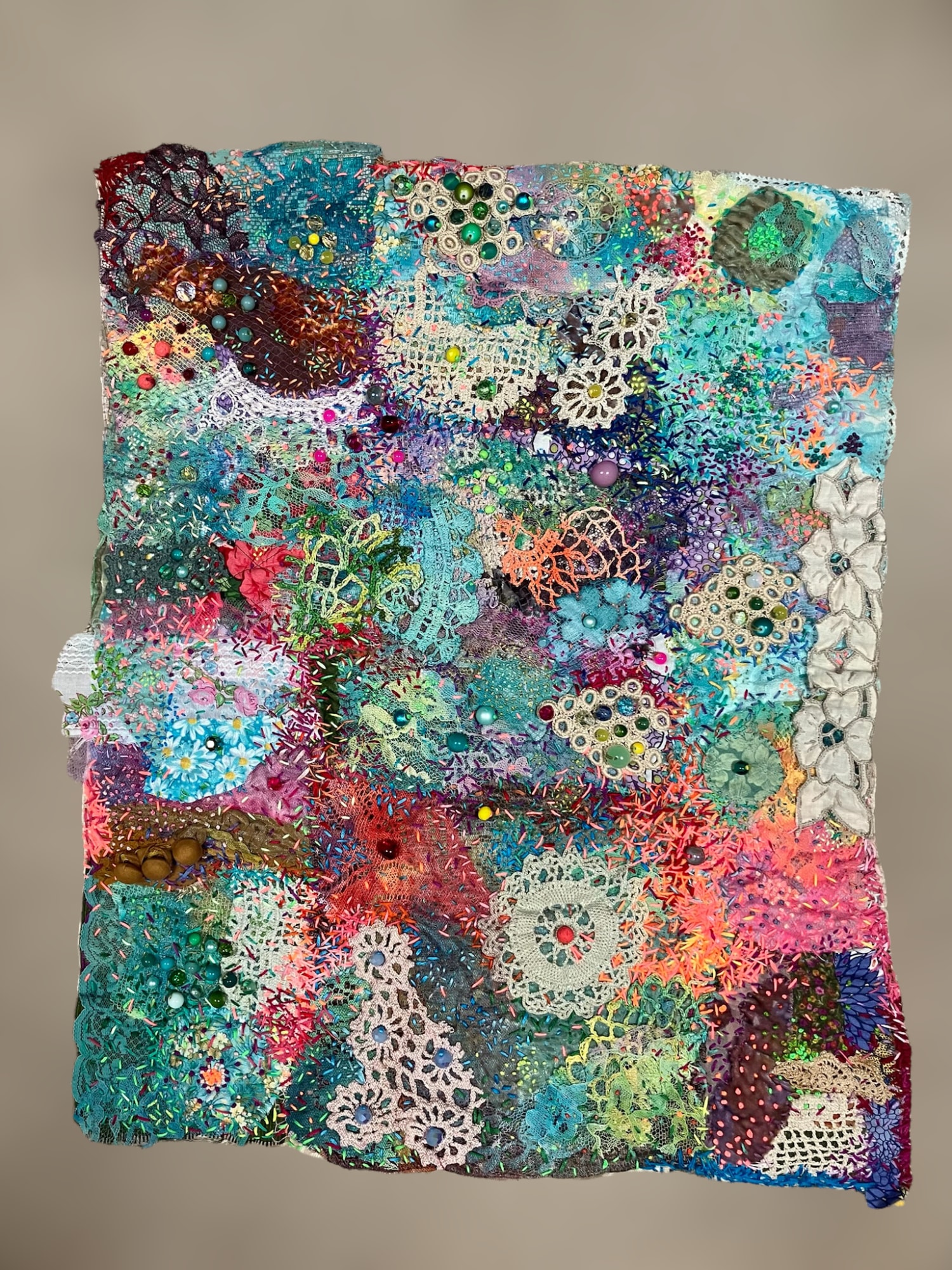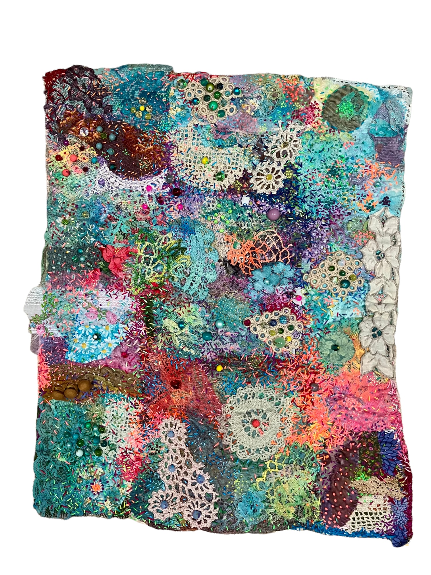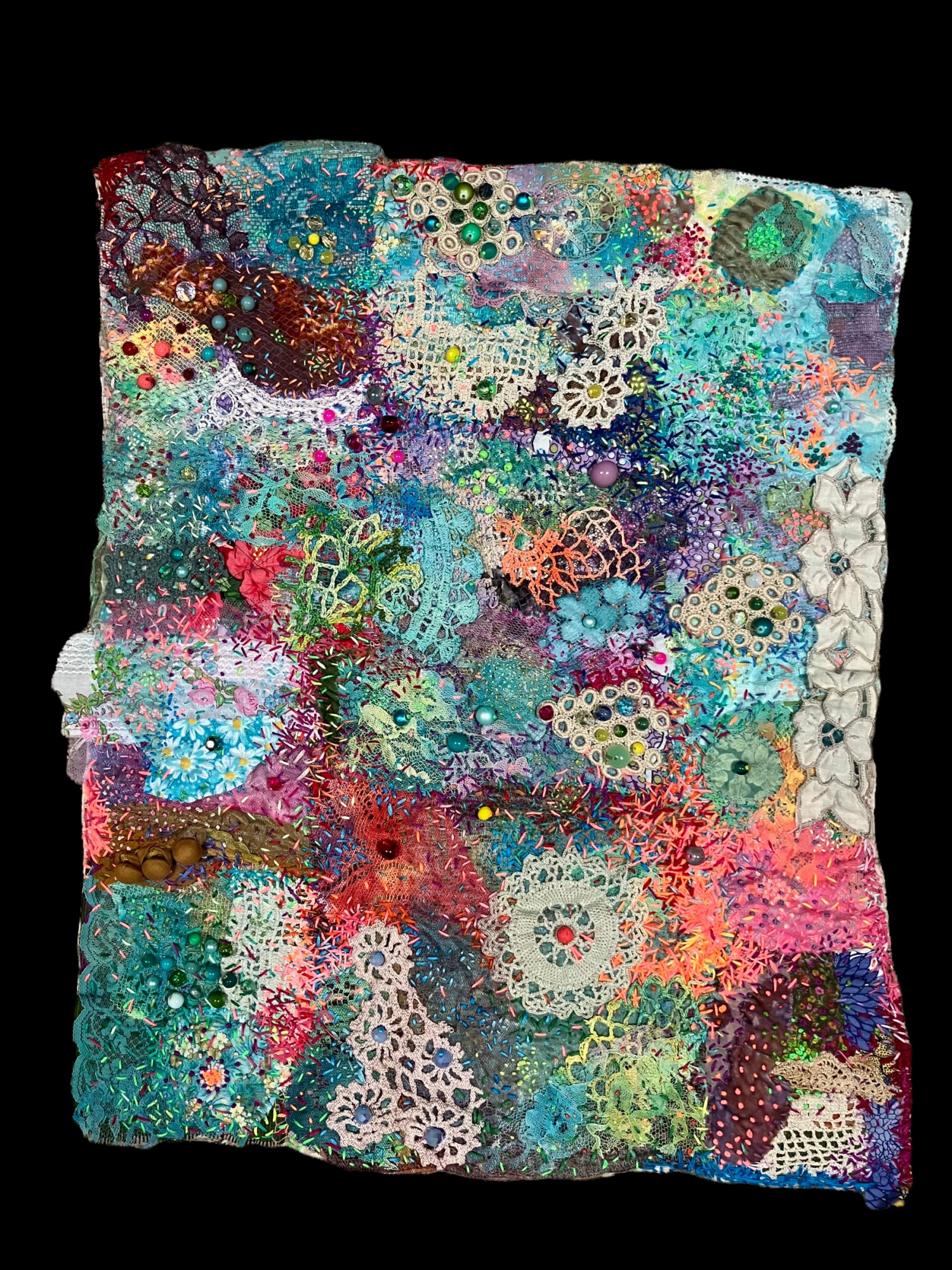 Painted vintage lace, salvaged fabrics, embroidery floss, beads