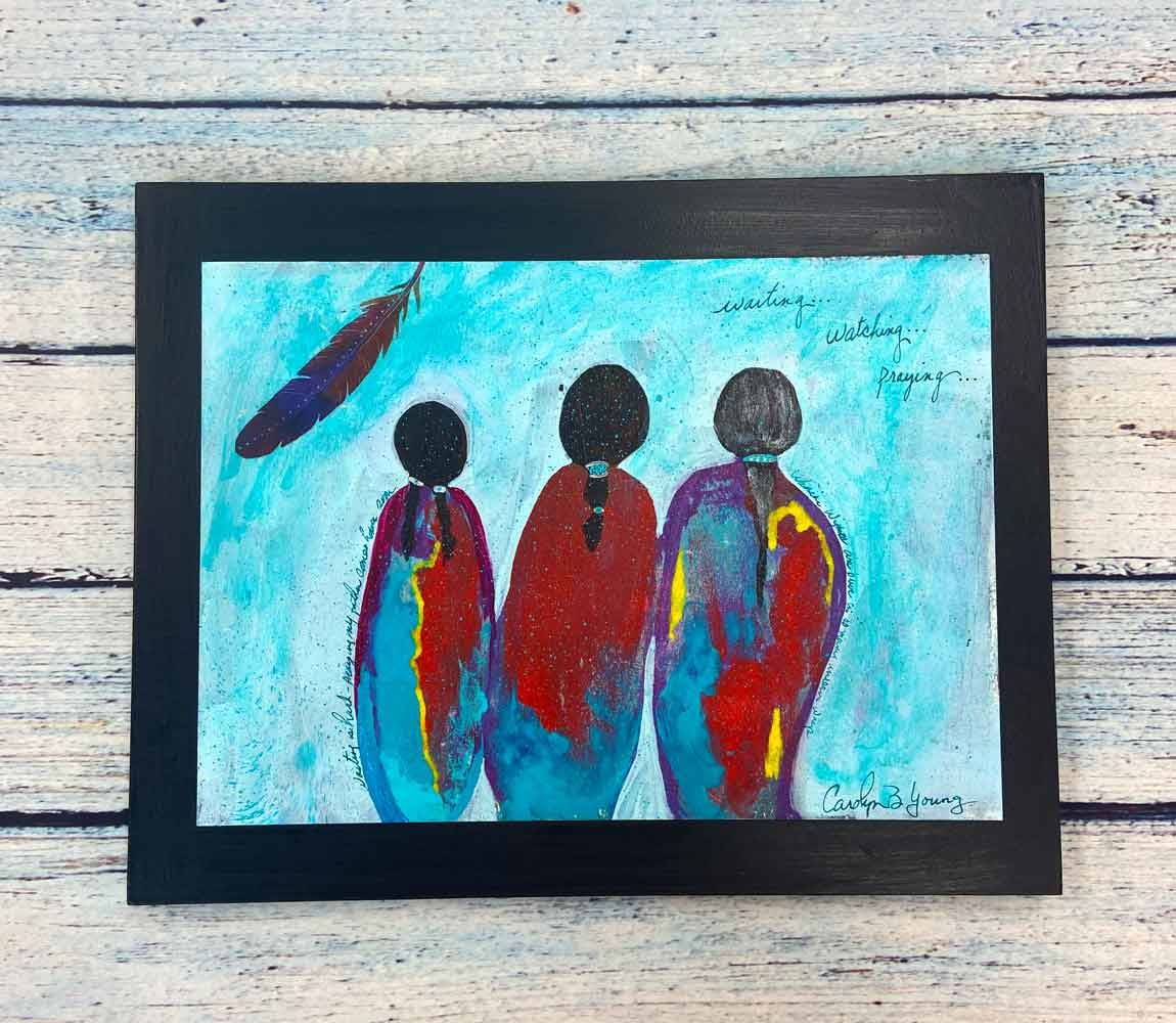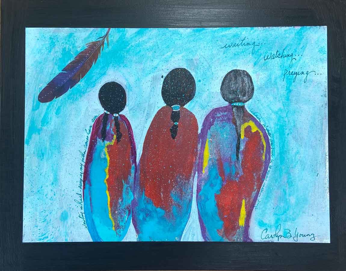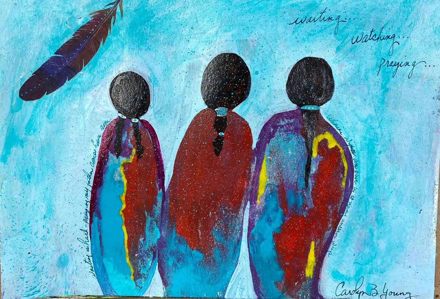 Choctaw women have been known to pick up the weapons of a fallen husband in battle and continue the fight. In this painting, the women are waiting for warriors to return. The two on the right have husbands they await. The one on the left is an unmarried girl, awaiting her father's return.