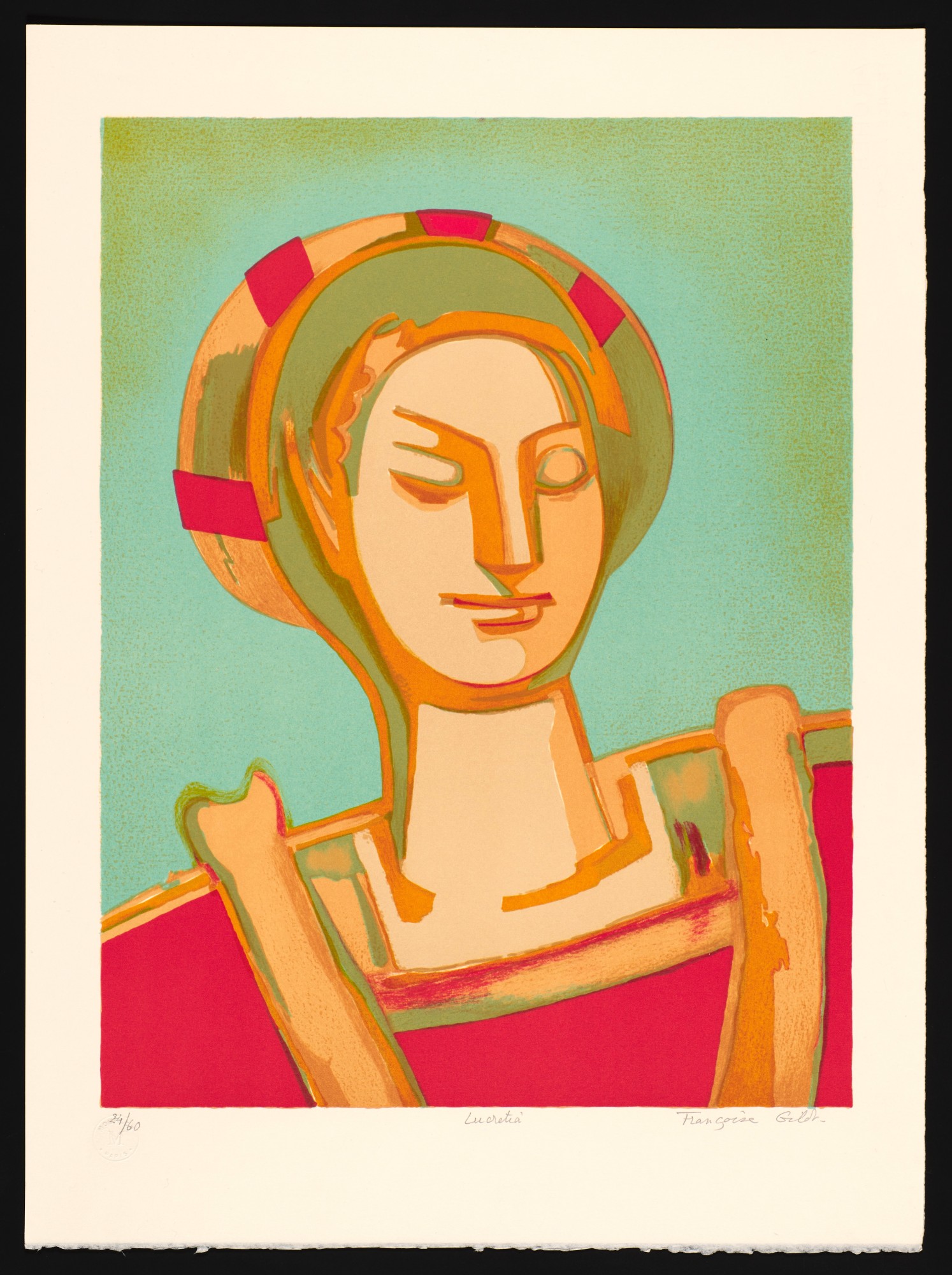 Portrait of Lucretia Printed in seven colors: light blue, flesh tone, bistre, gray, ochre, red, brown,