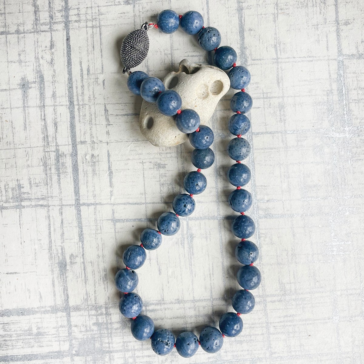 Naturally blue coral is hand knotted on silk. Easy on magnetic clasp finishes this at 18" in length.
