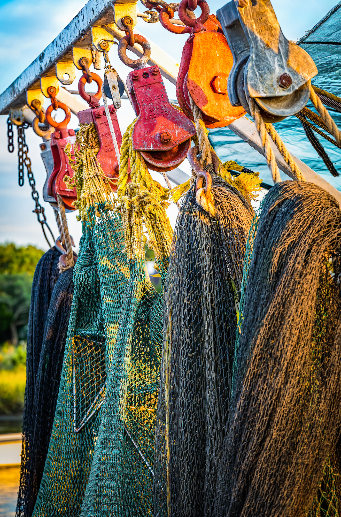 This image is a section of shrimp nets and pulleys from a shrimp boat on Shem Creek in Mount Pleasant, SC.