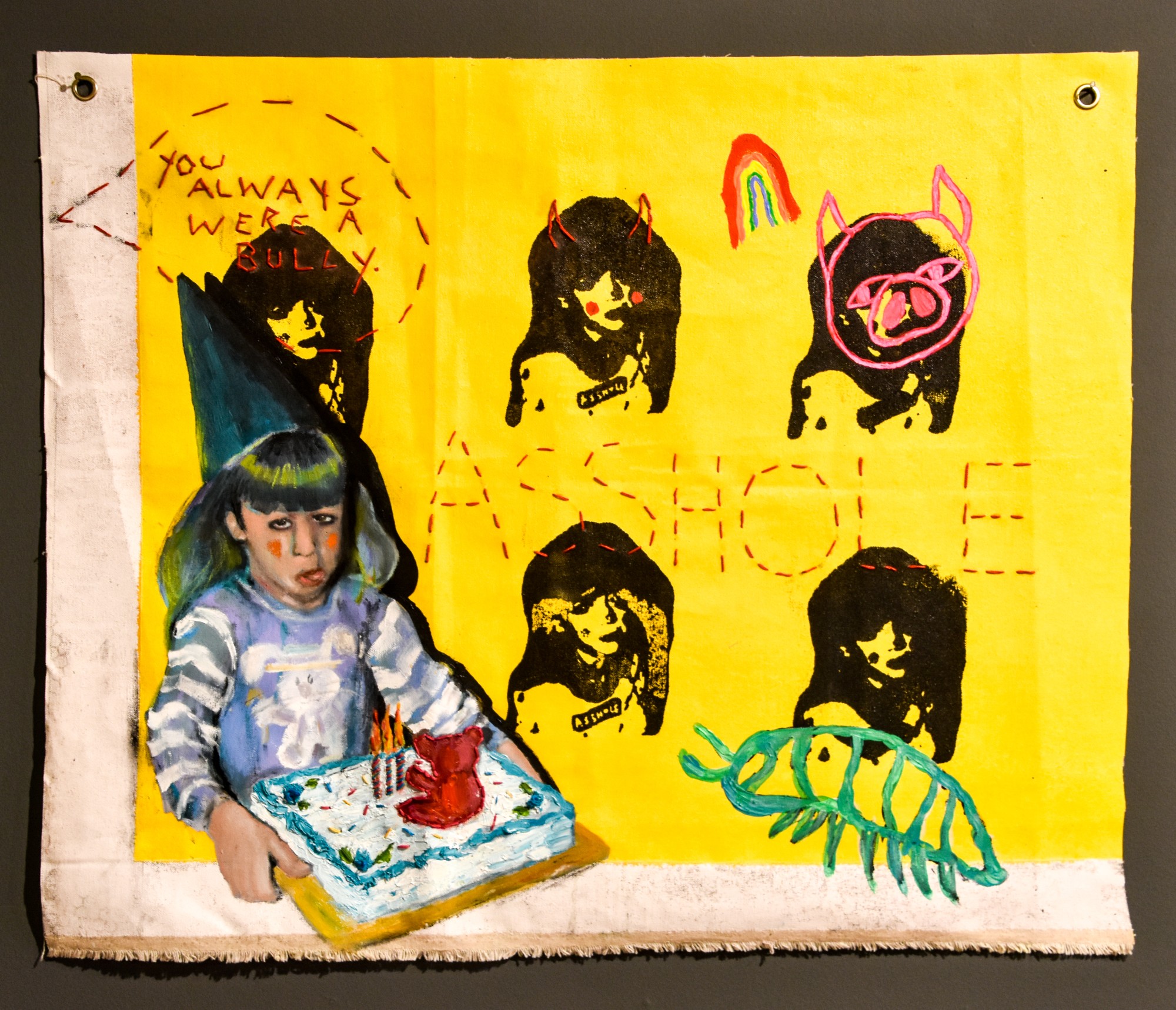 Acrylic, Screenprinting, Oil, Soft Pastel, Charcoal and Embroidery on Unstretched Canvas