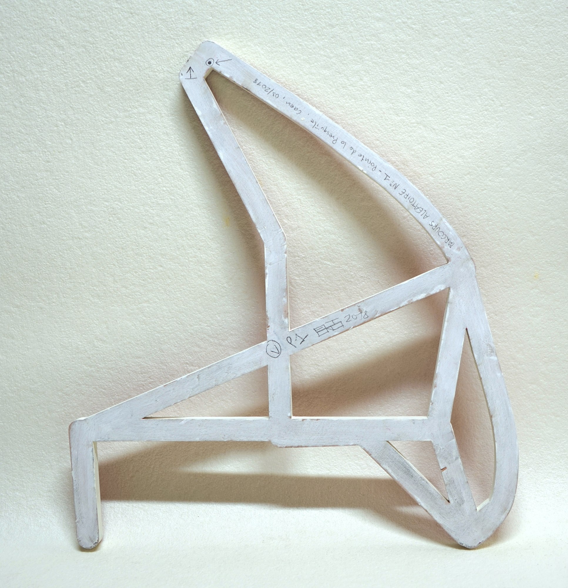 For this random walking exercise, I defined 23 points at key spots around the Pointe de la Presqu'ile area in Caen (building angles, crossroads and corners). The goal was to walk from one point to another choosing at random the next point. The route started at point n.1, had to go through 10 points and finished again at point n.1. The result of each stroll generated a design that was then converted into a wood sculpture. I traced 11 routes. Each sculpture represents a 20 to 40 minutes stroll on a distance from 2 to 3 km.