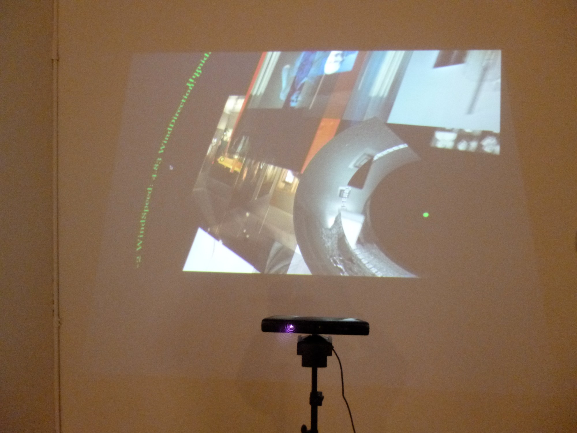 Interactive projected media installation, alternative approach to information access. A Kinect camera is used to move the data objects around in space. Challenges ideas of web framing, web layout, corporatization of the internet. GH wrote an html parser to get around the MoMA’s web page layout and grab the current exhibitions images, which were made public on the internet. Importing static media form into a dynamic space. Users interact through their body movement. Users also hear the RSS feed from an art blog "Hyperallergic" being read by a synthetic voice. A live weather feed in the form of a text circle forms a ring outside of the ring of images produce from MoMA. The Kinect camera’s infrared video is mapped onto the cylinder in the center putting the viewer in the work. Sofy Yuditskaya collaborated with GH on the code to bring this work to fruition.