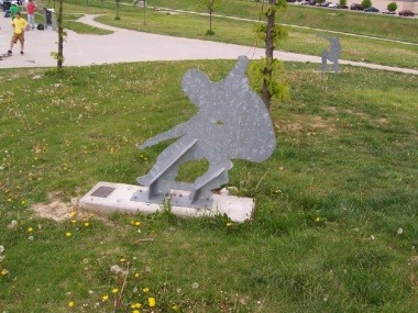 These two silhouettes of skate boarders watch over the entrance to Roberts Park, the City of Omaha's first skate park, which was opened October 25, 1999. They are dedicated to the memory of Mathew Kress and Tommy Craft who led the campaign for a place where skateboarders would be welcome.