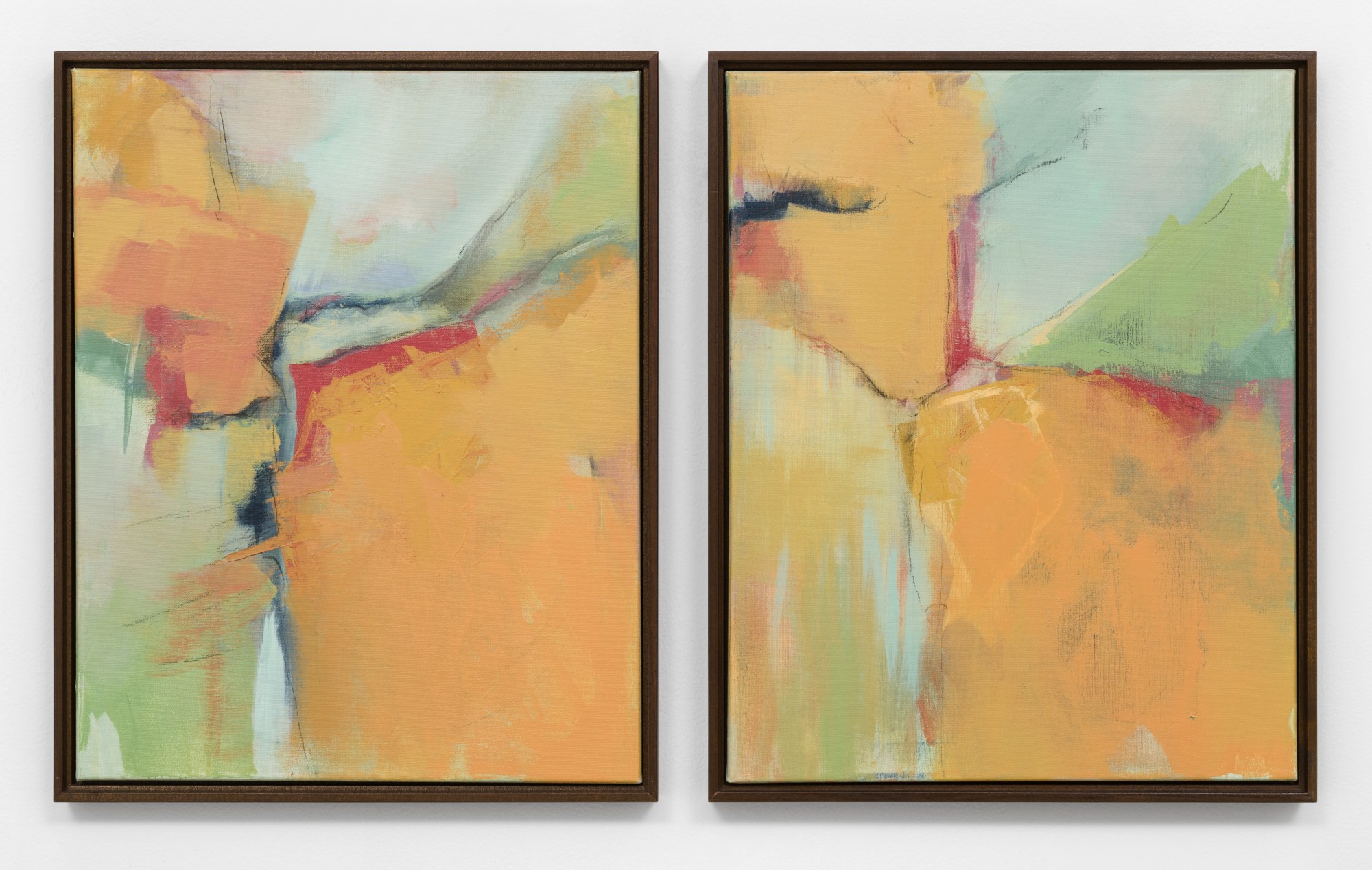 Two rocky ochre, flesh colored images touch and seemingly kiss across the ground. Hints of red and lime green.