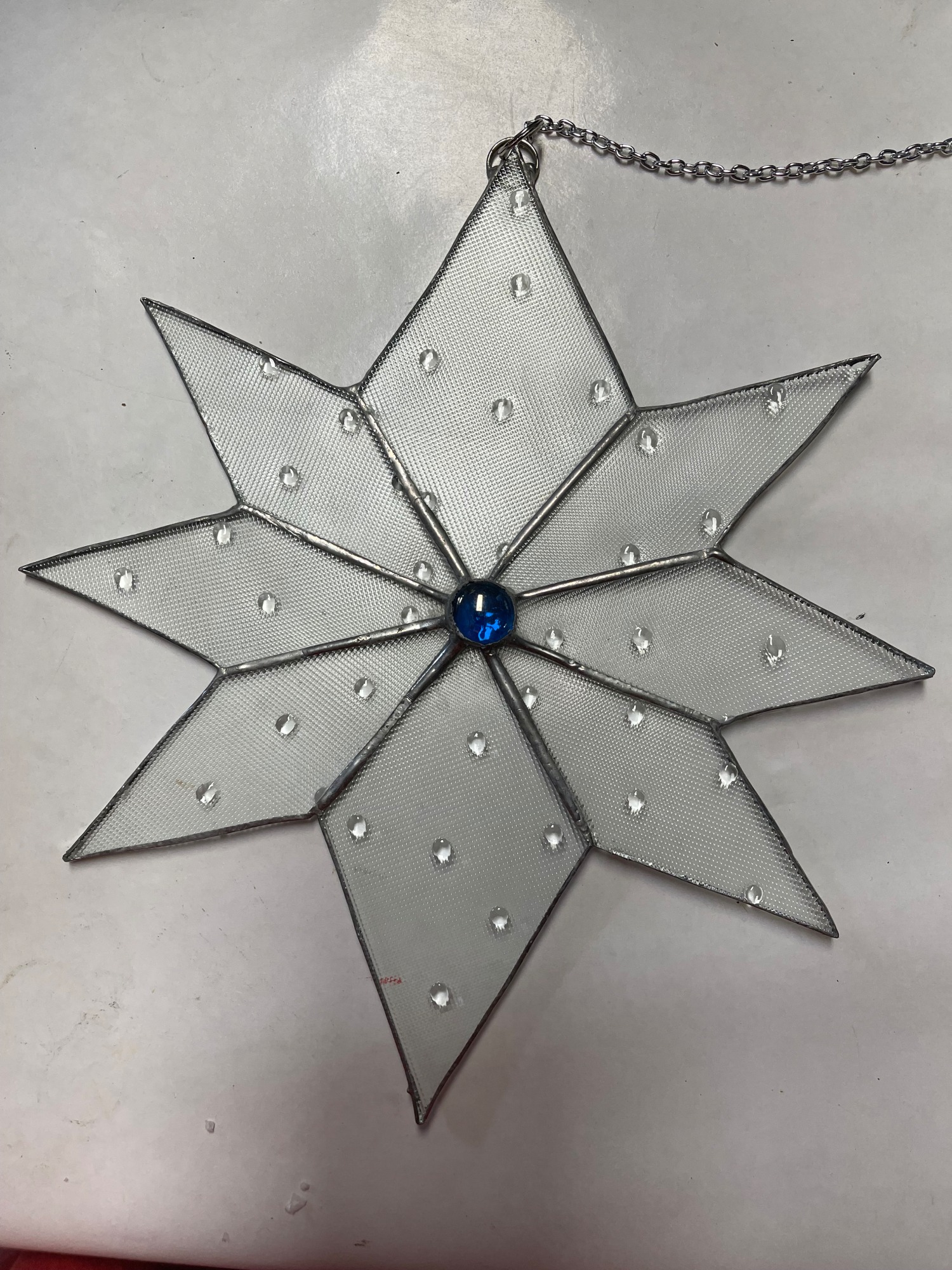 Snowflake design using clear patterned glass (8 pieces) and one blue jewel in the middle
