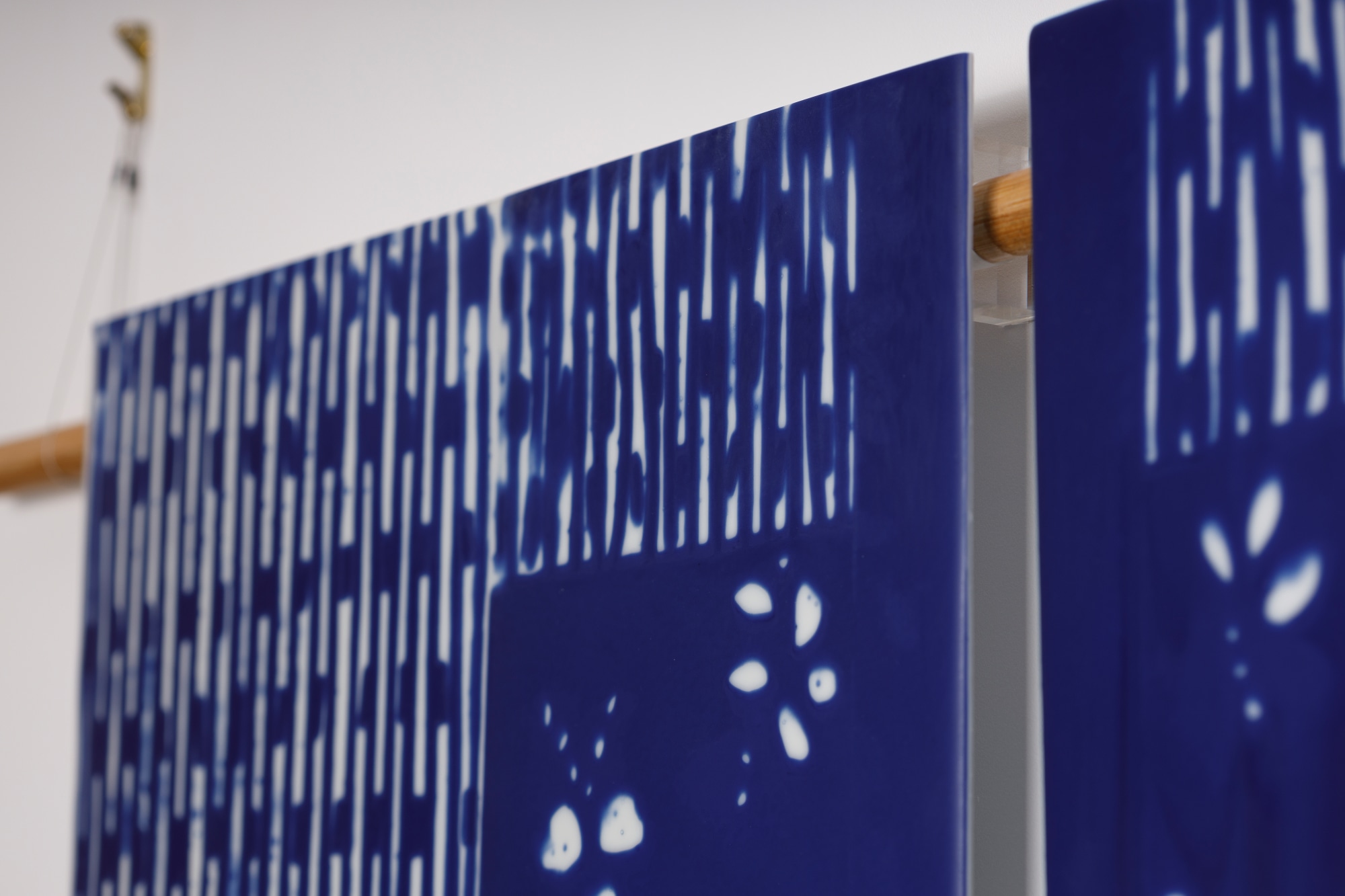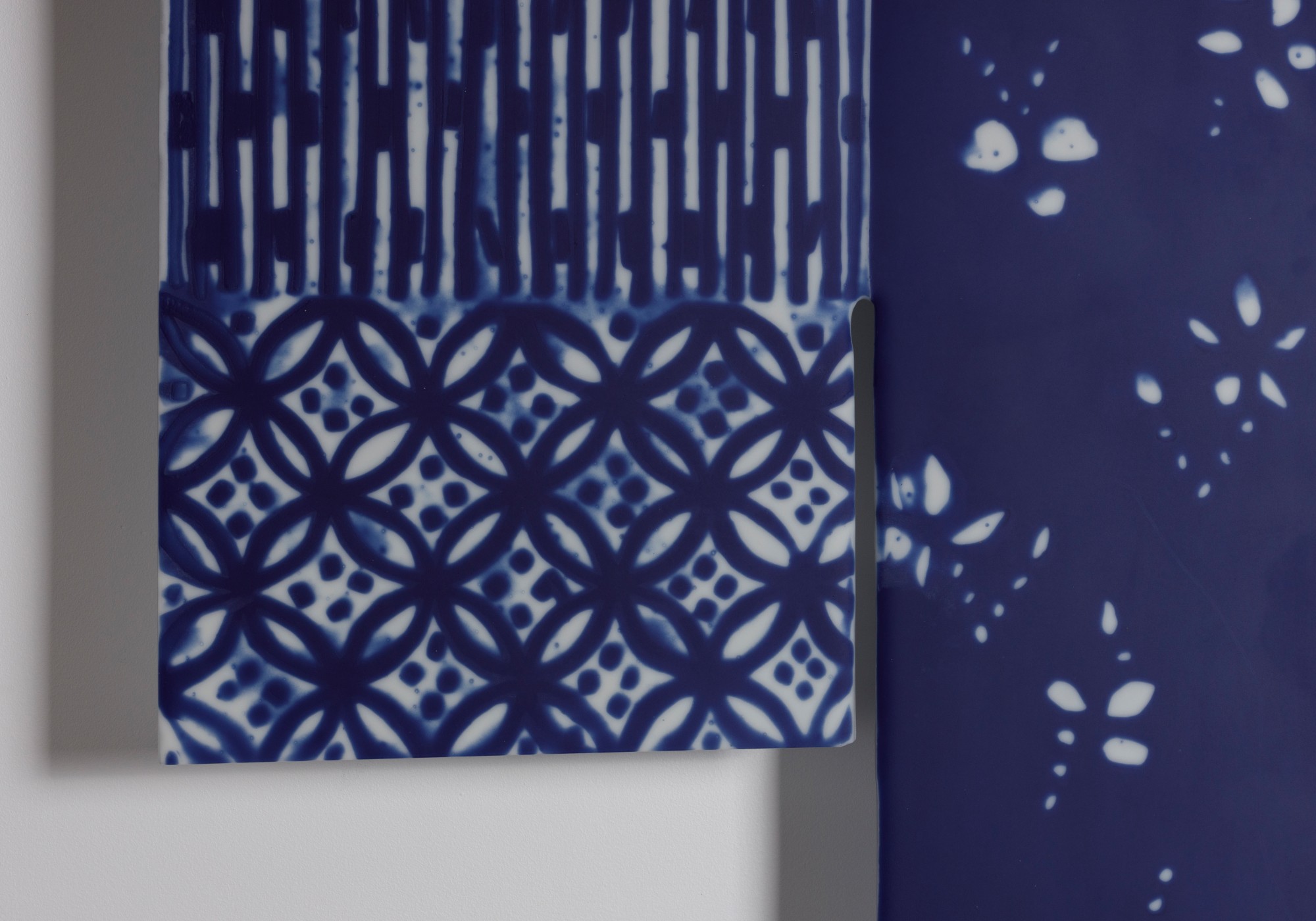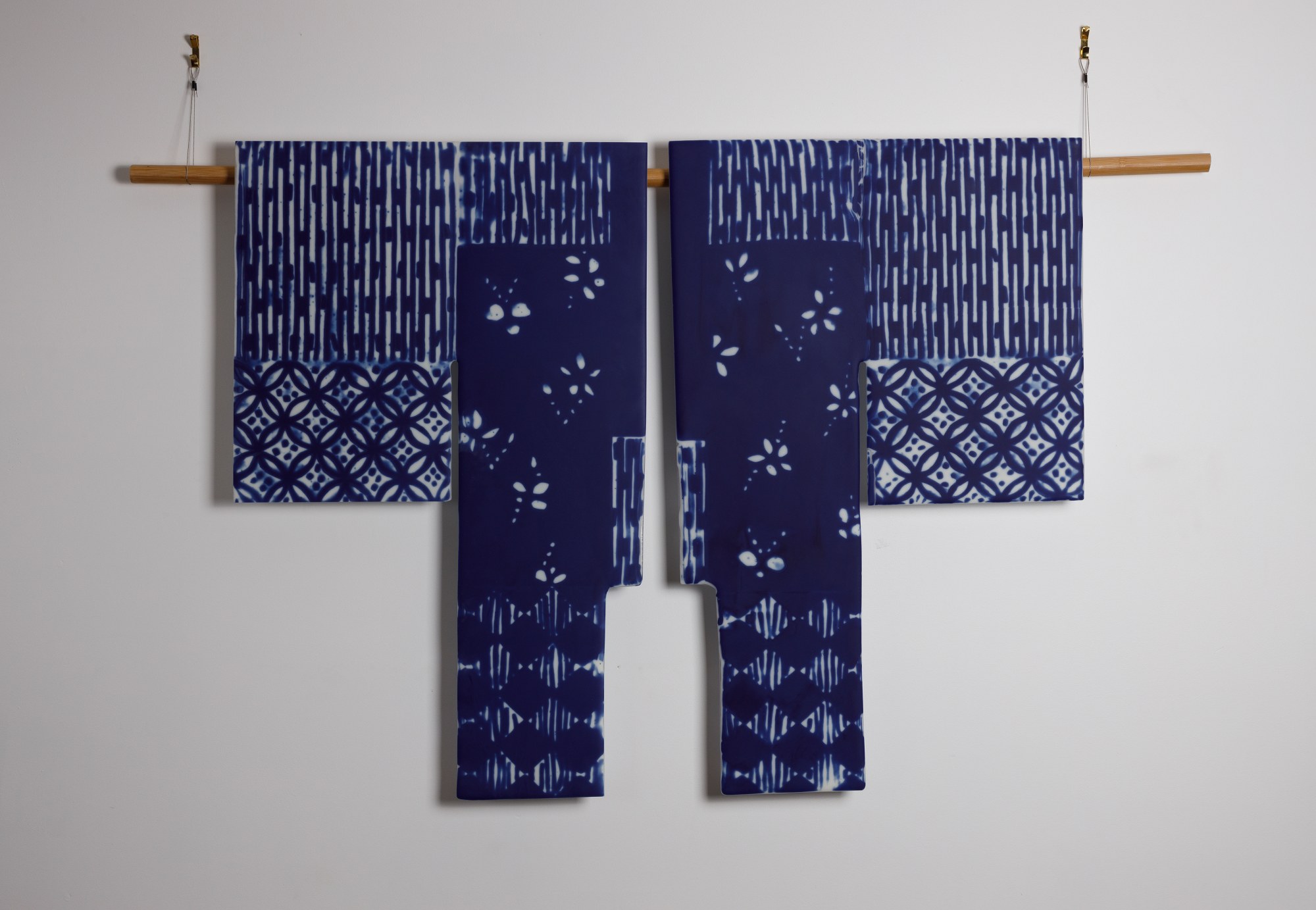 Indigo dying has been a long tradition in Japan, using “knotweed” brought over from China. Originally used to dye cloth by women for the family, it developed into a commercial exploit, with dye houses in each village, and where women were excluded. Indigo dyed fabric was sold at inflated prices, while the peasant communities had to make do with the smallest pieces of cotton. This resulted in many garments being made from patchwork fabric. This story of capitalization is common around the world, with people being left behind. My mother came from northern Italy and worked in a textile factory as a weaver from the age of 13. I was taught to sew at an early age and have since learnt to spin and dye textiles, indigo being the most fun as the indigo bath is enduring. I have made a number of glass pieces which represent indigo dyed fabric from areas around the world, in celebration of hand crafts. This piece is in the form of a kimono which means “thing to wear”.