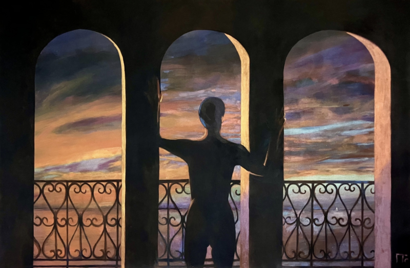 Intimacy is a recurring theme in my paintings. This year, I’ve primarily painted skies. Characters, animals, and birds occupy these spaces, along with simple arches. These serve as metaphors for the beauty humankind can create.