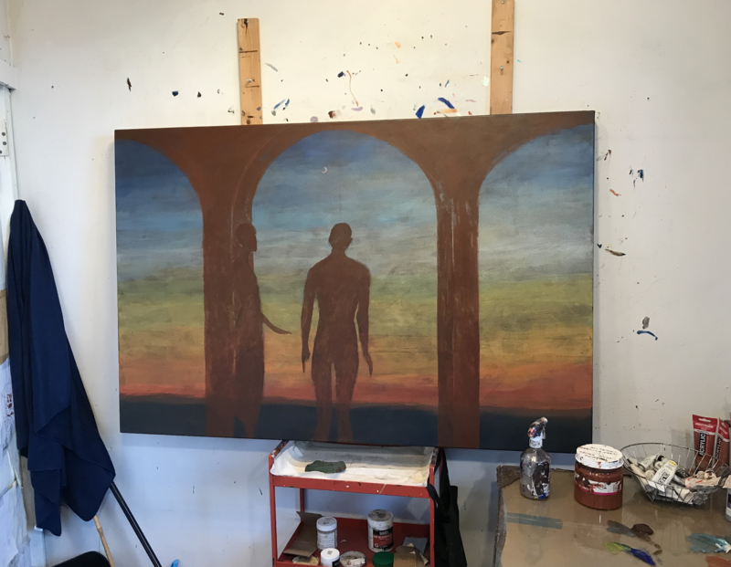 A look inside MŌ's studio and an unfinished version of her painting, Paradise Lost, 40 x 60 in