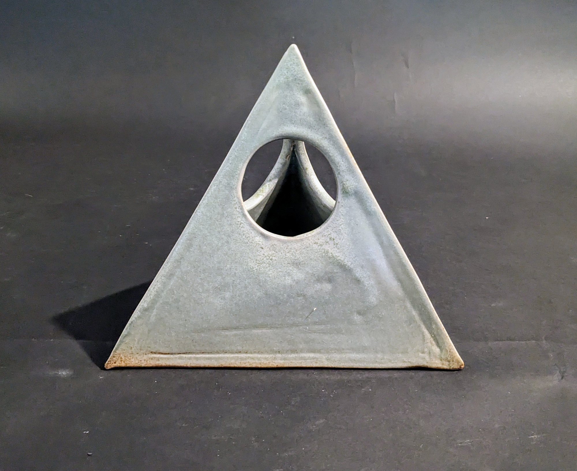 Triangular prism sage-colored ceramic ikebana vase with three holes, one on each facet.