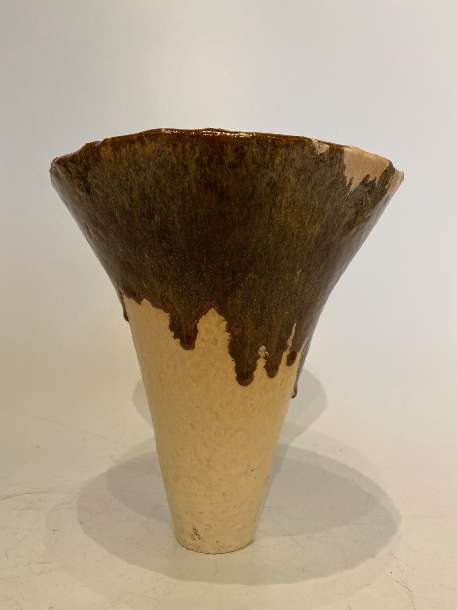 Trumpet-shaped ikebana vase crafted from cream-colored ceramic, featuring a brown dripped glaze accentuating the upper portion.