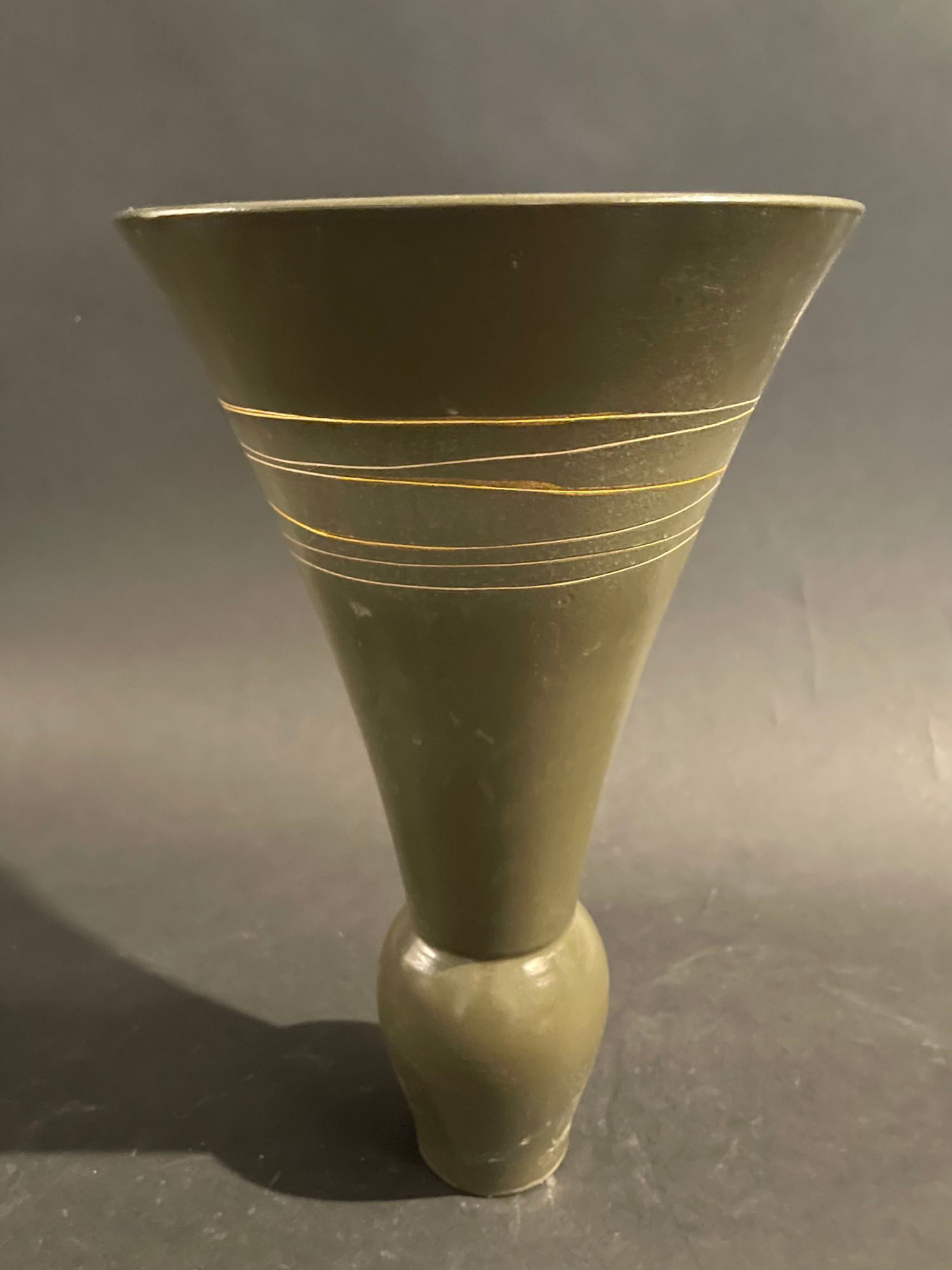 Trumpet-shaped ikebana vase in dark grey ceramic, adorned with incised horizontal cream lines encircling the upper neck near the rim - Ikenobo School.
