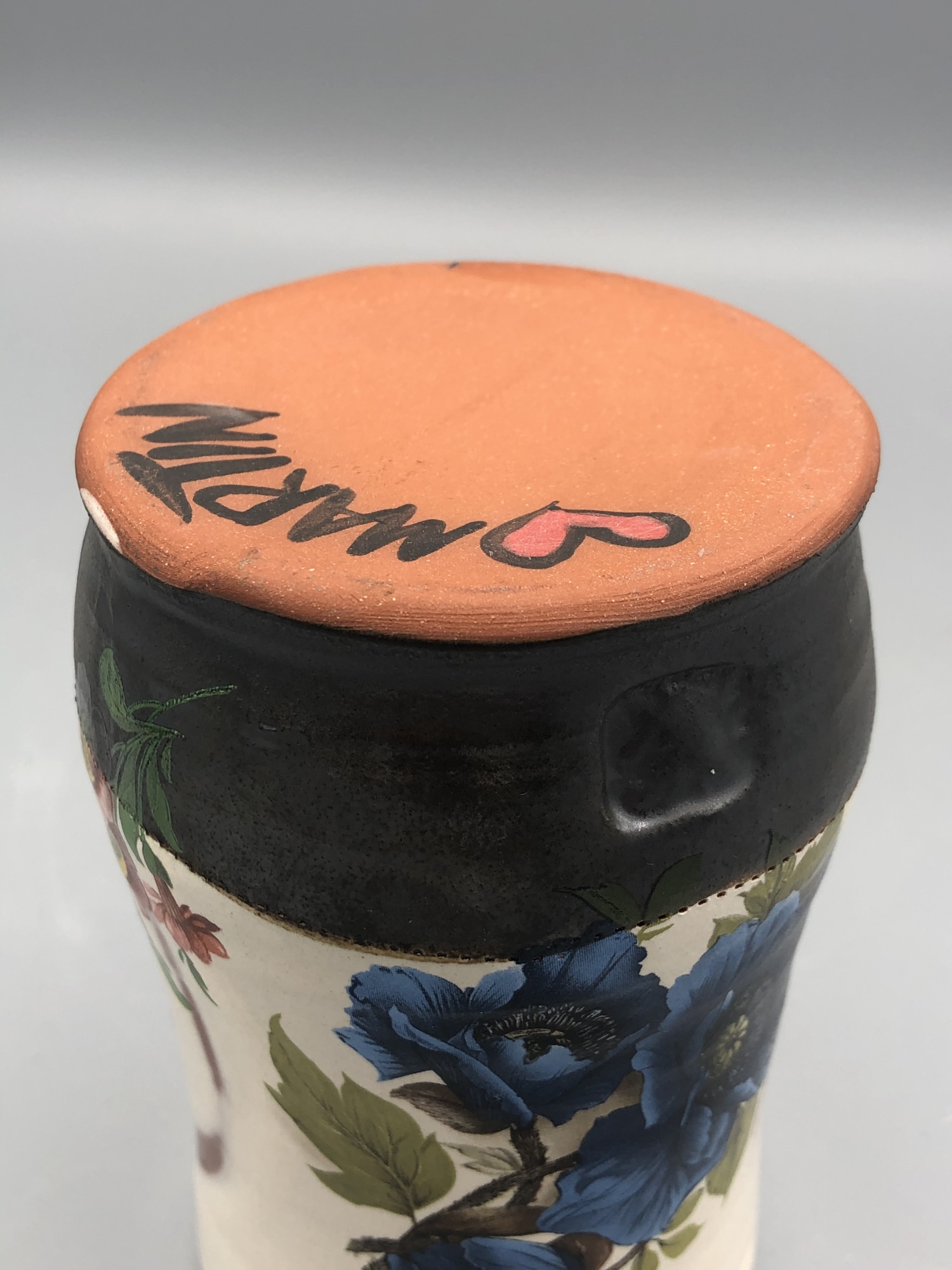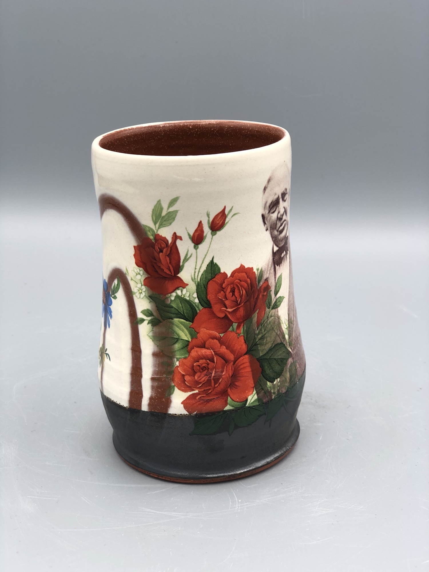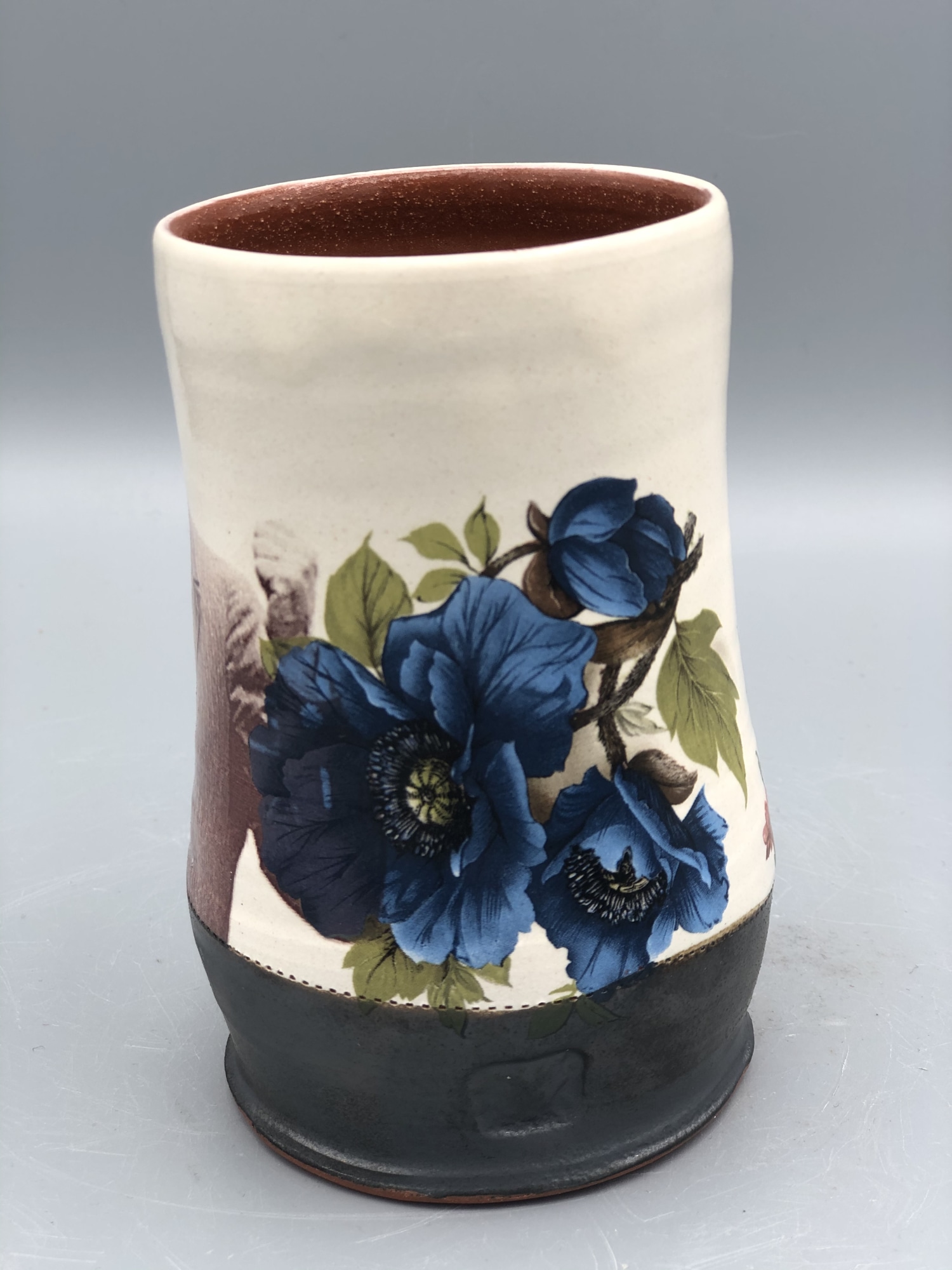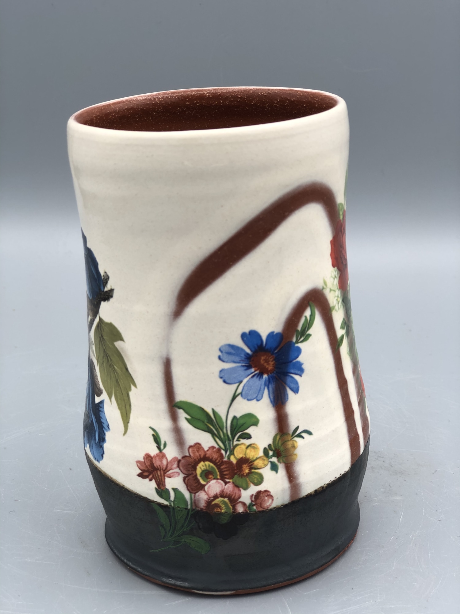 Wheel-thrown earthenware mug with white clay slip, floral and iron oxide decals, and clear glaze. Fired four times in an electric kiln.