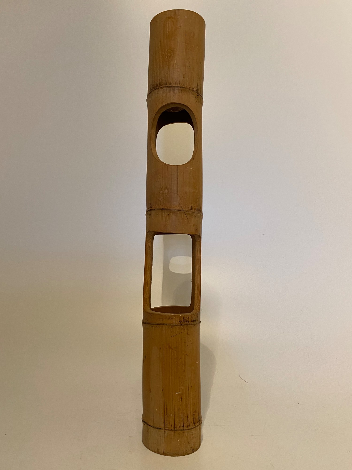 Tall, tubular bamboo ikebana vase featuring two openings for floral arrangement.